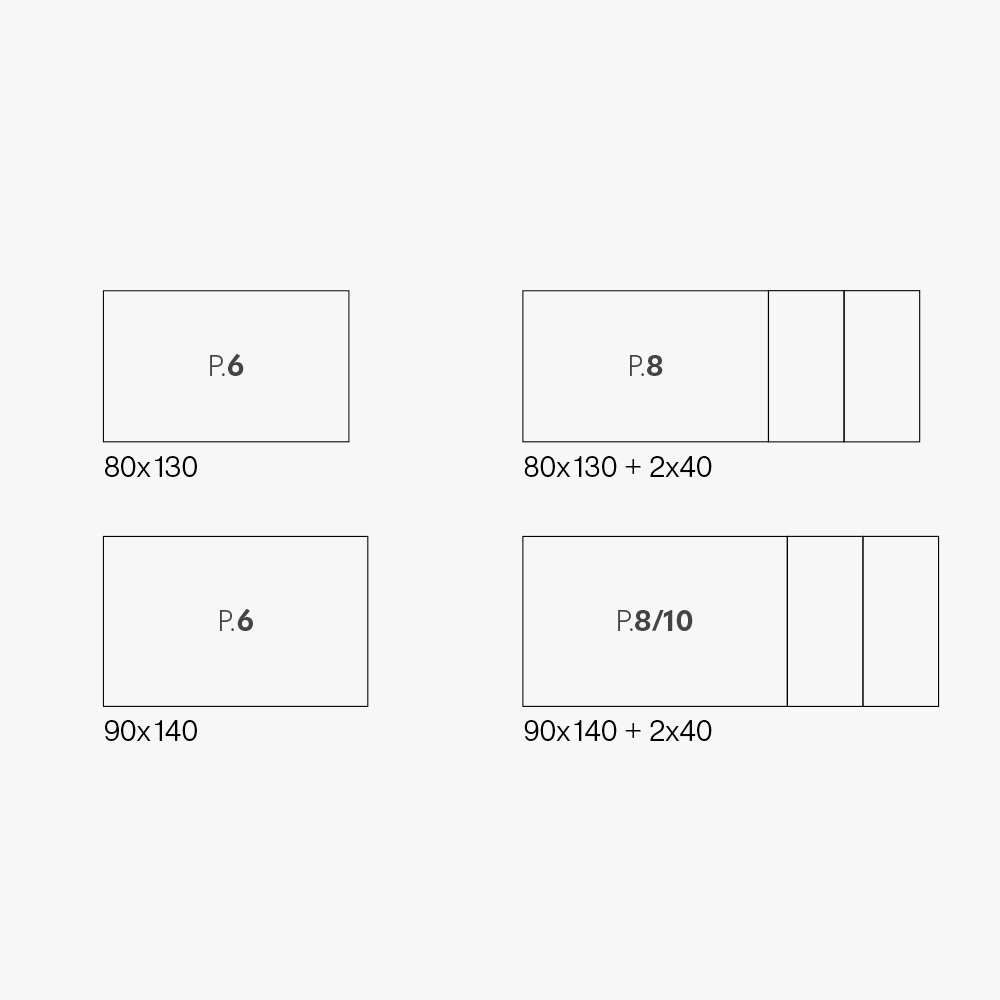 Available sizes:- length 130/210 cm x depth 80 cm x height 75.5 cm - 2 extensions of 40 cm