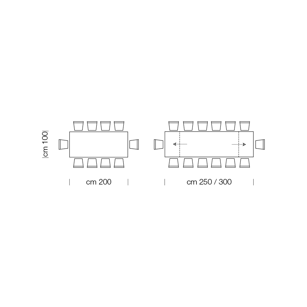 - L 200 (300) x D 100 x H 76.5 cm 14 seats extendable with 2 external 50 cm extensions.