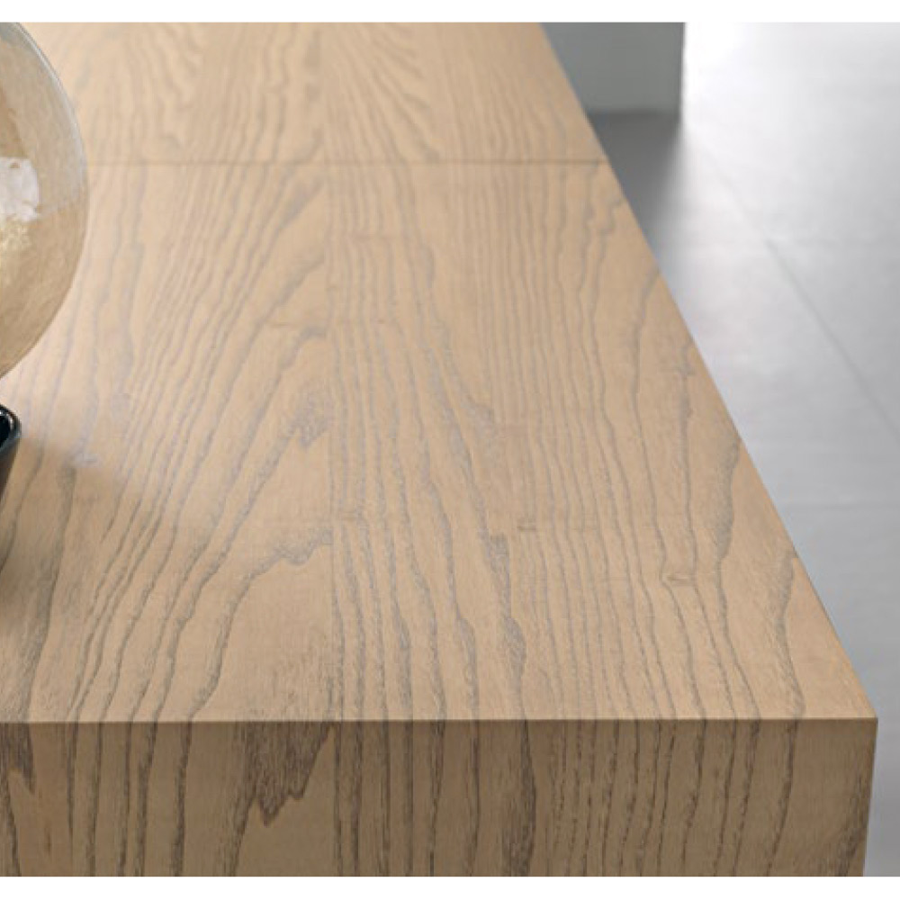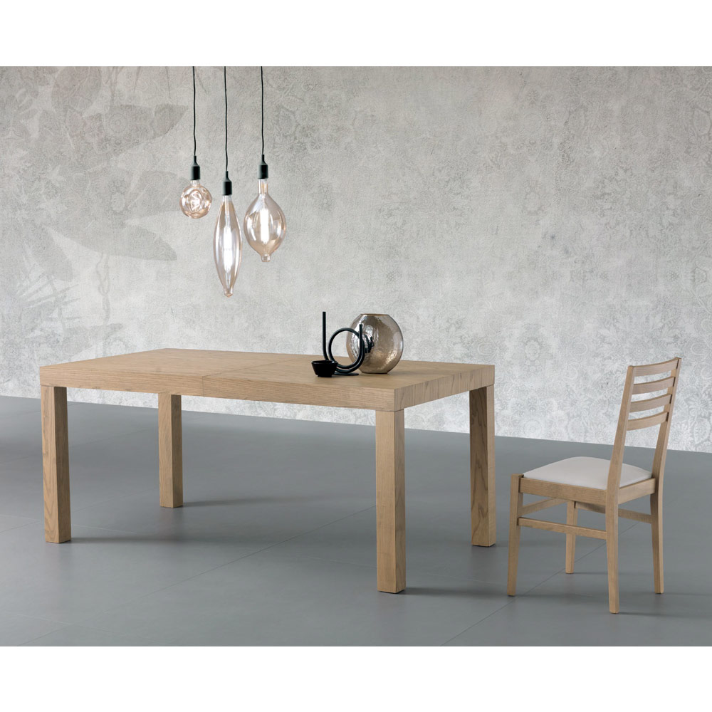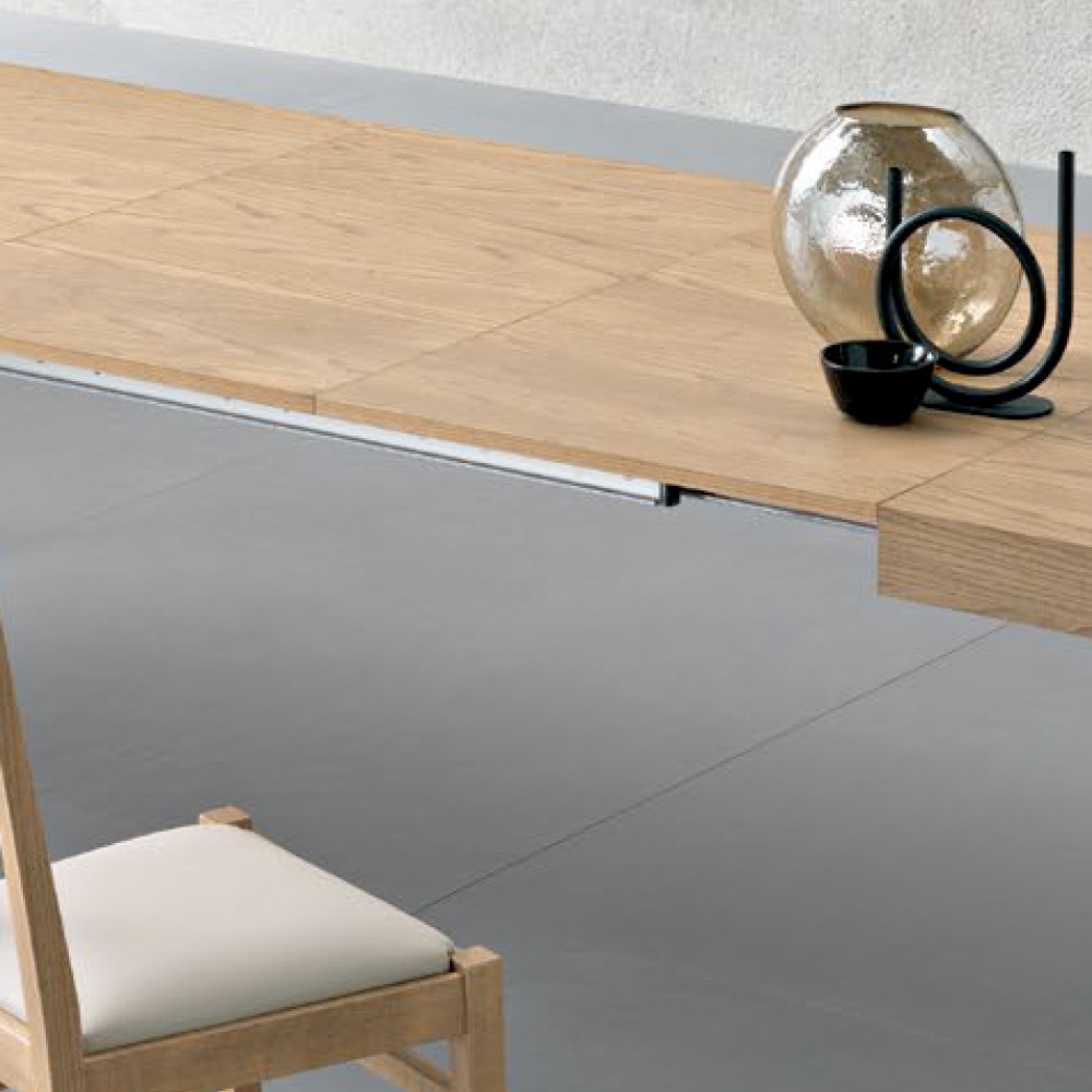 Extendable rectangular table with ash veneer top. 80 mm thick, folding finish.
