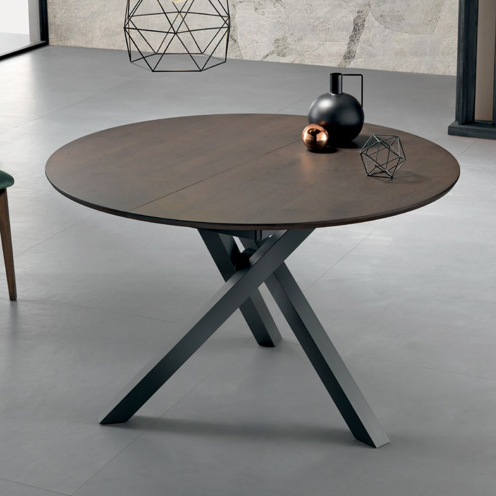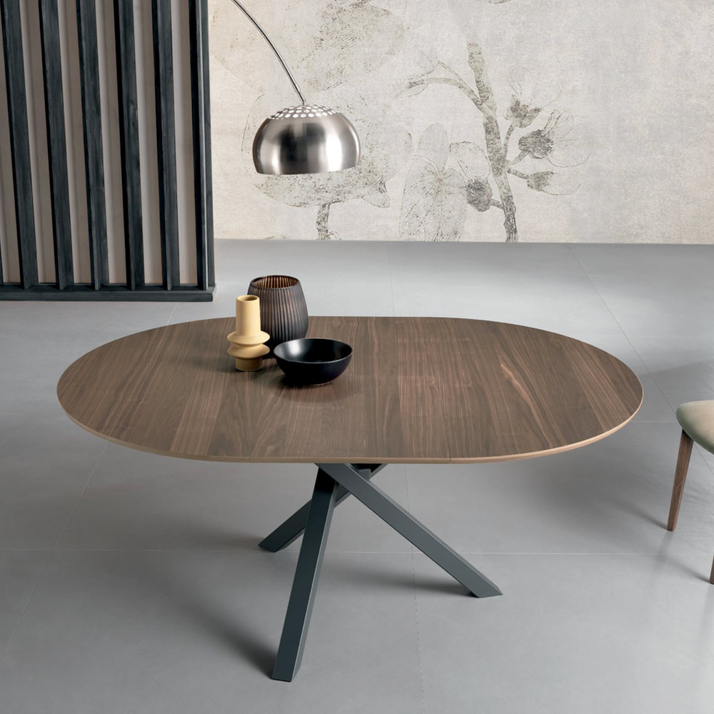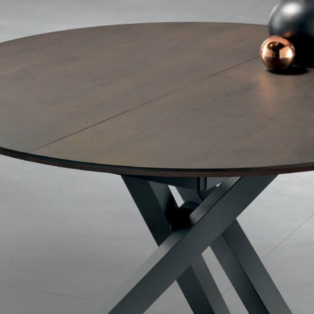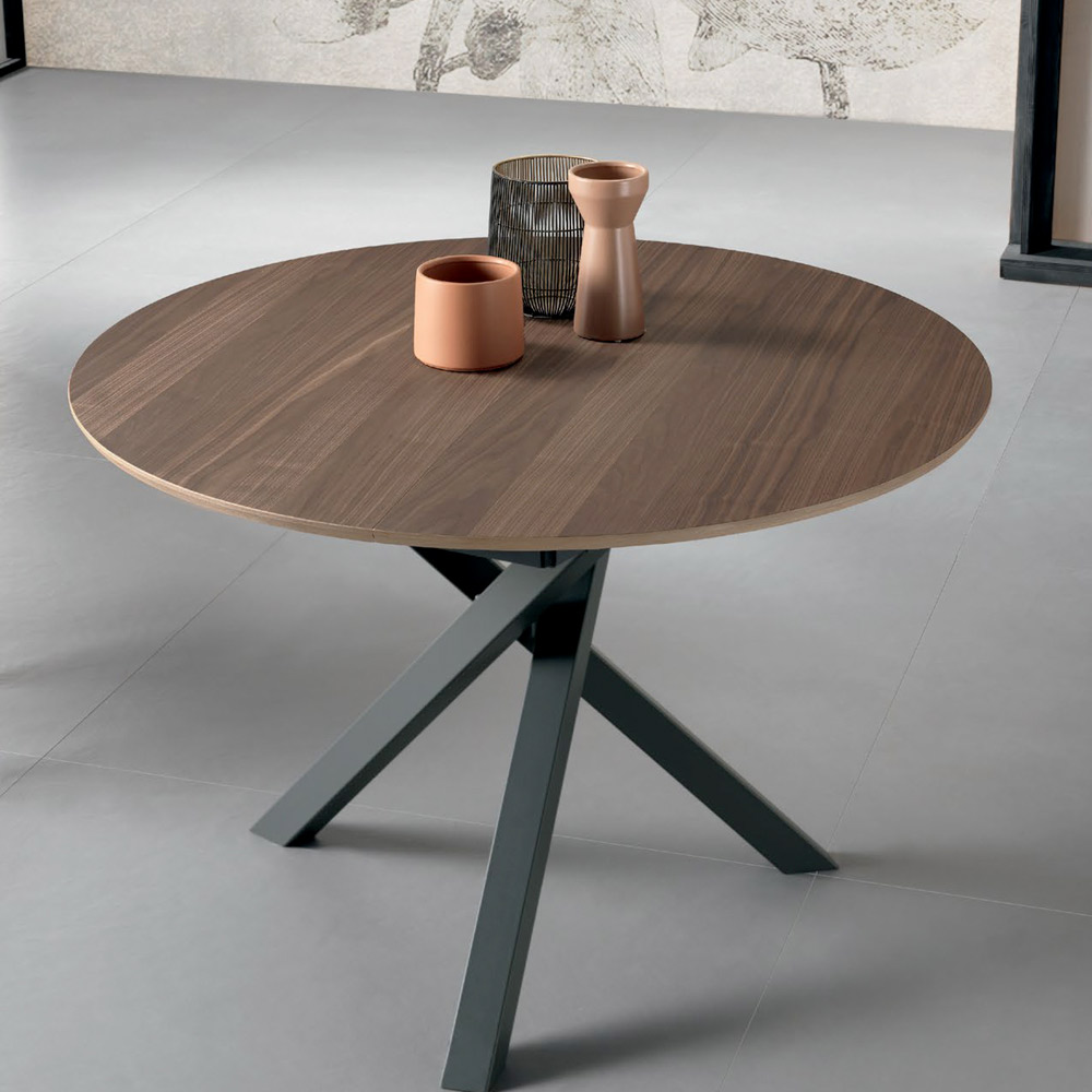 Round table, diameter 120 cm, extendable to 170 cm, with 20 mm thick Canaletto walnut veneer top and slanted profile.