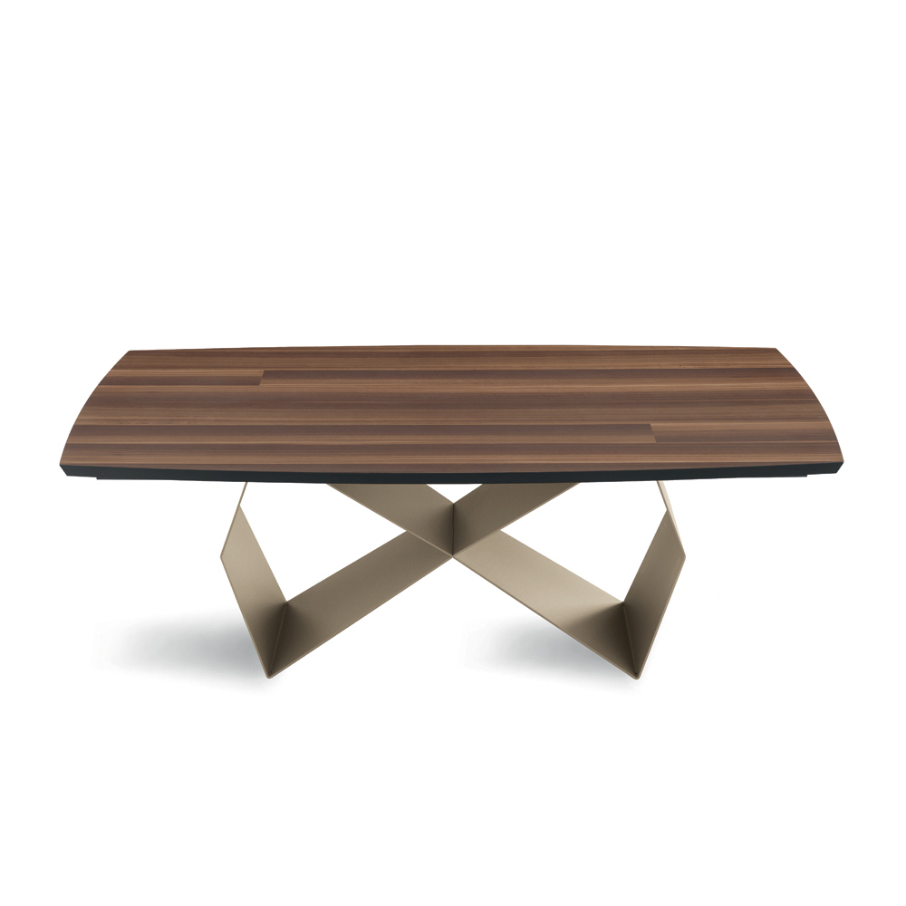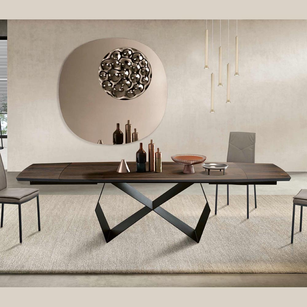The metal legs, featuring a bold, geometric shape, are painted to contrast beautifully with the wood tone. This combination of materials not only provides solid stability but also adds an impactful visual element, making this table a real focal point in any dining room or open plan area.