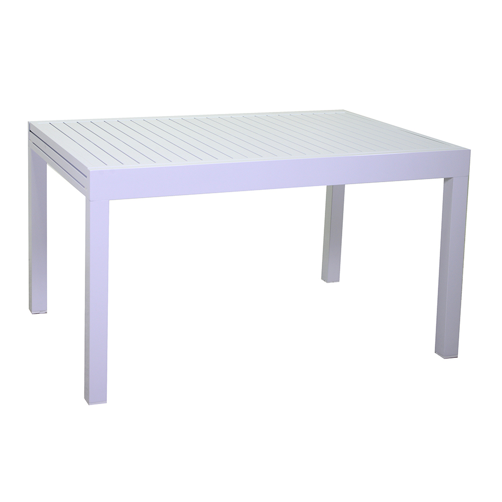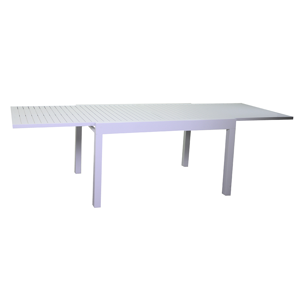 Outdoor table made with powder coated aluminium frame and slatted aluminium top. The table is extendable with side wing opening.