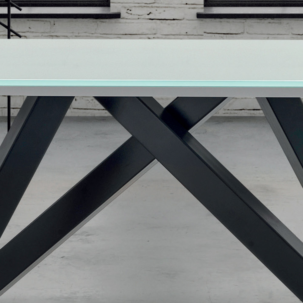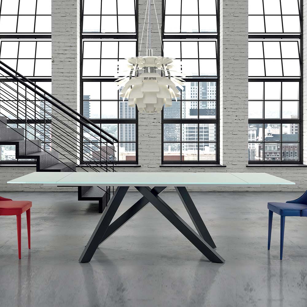 Extendable kitchen table up to 278 cm with glass top and black steel base made in Italy.