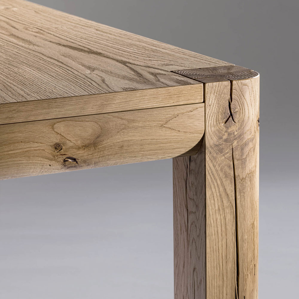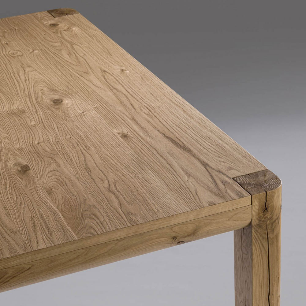 Extendable table with natural oak veneered blockboard top and solid square legs with cracks and knots 12x12cm. Dimensions H 77 cm, thickness 3 cm.
