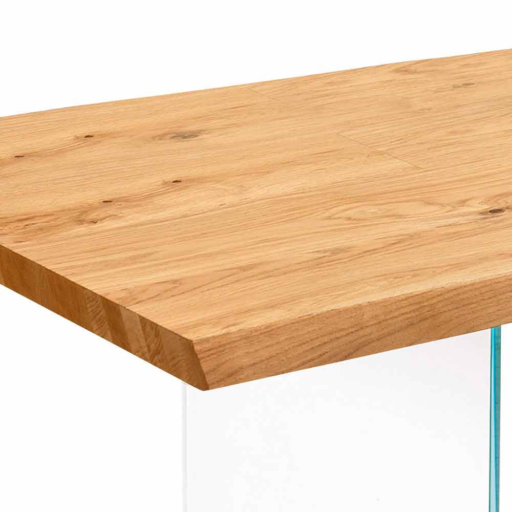 The Nico table is characterized by a design played on the contrast between different materials such as wood and glass. The base is in fact made of 12 mm extra-clear tempered glass, while the top is in raw oak veneer with solid and debarked edges.