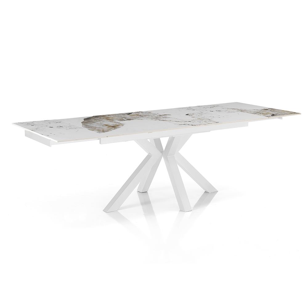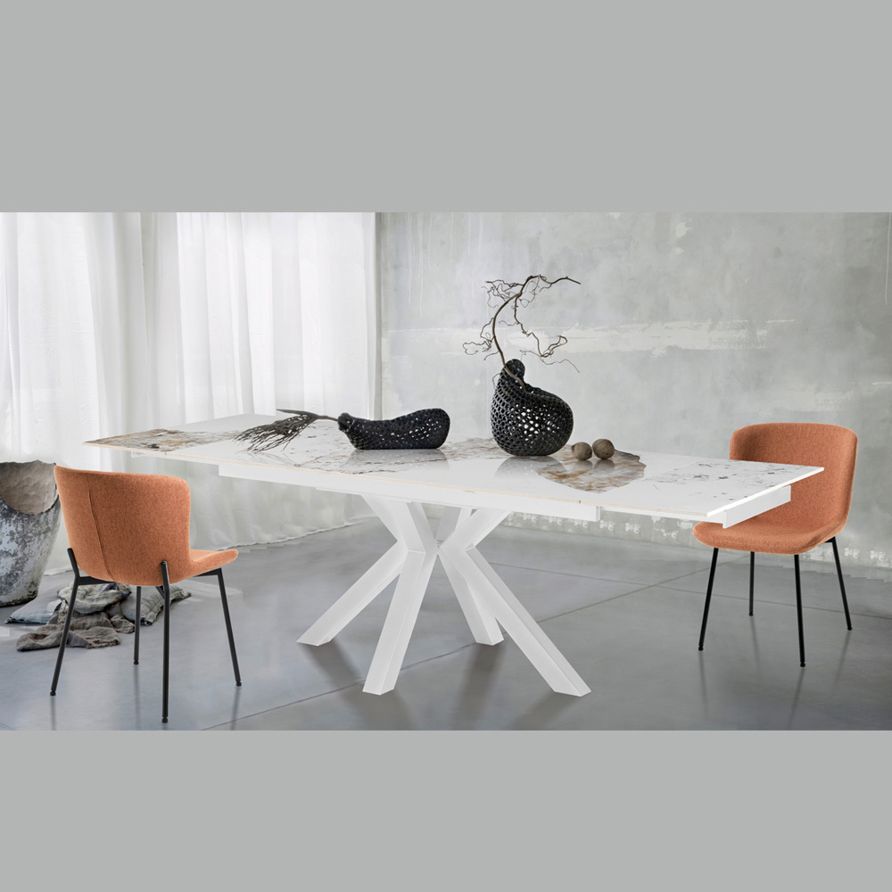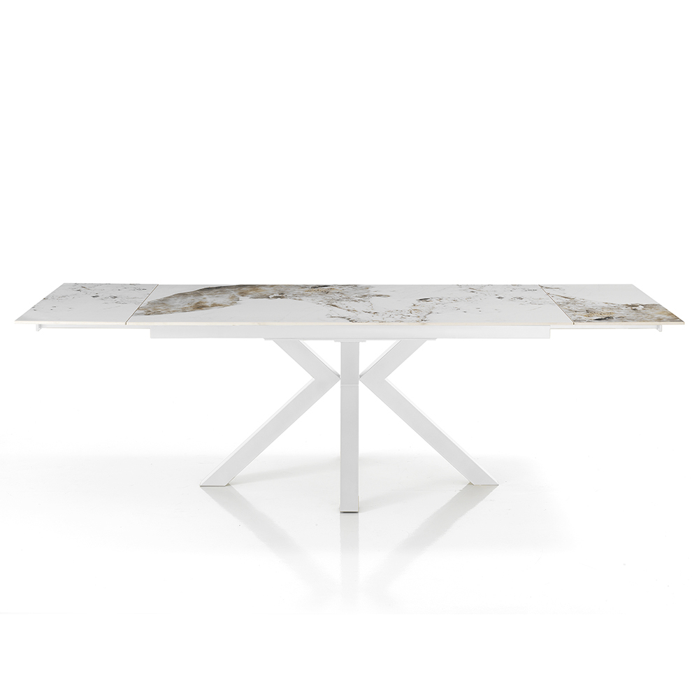 This extending table is a masterpiece of contemporary design, combining elegance and functionality in a single piece of luxury furniture. The table top, made of marble-effect ceramic, is characterized by intricate veining that gives uniqueness and personality to each piece.