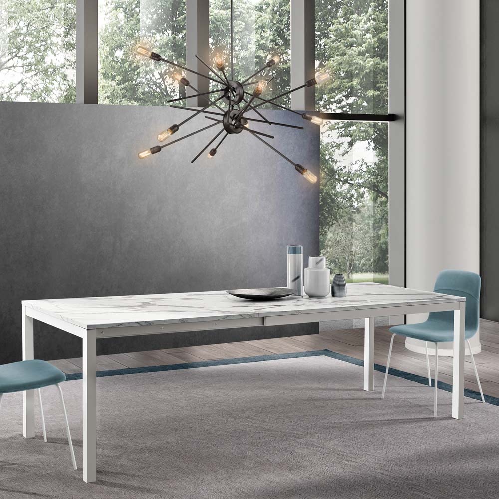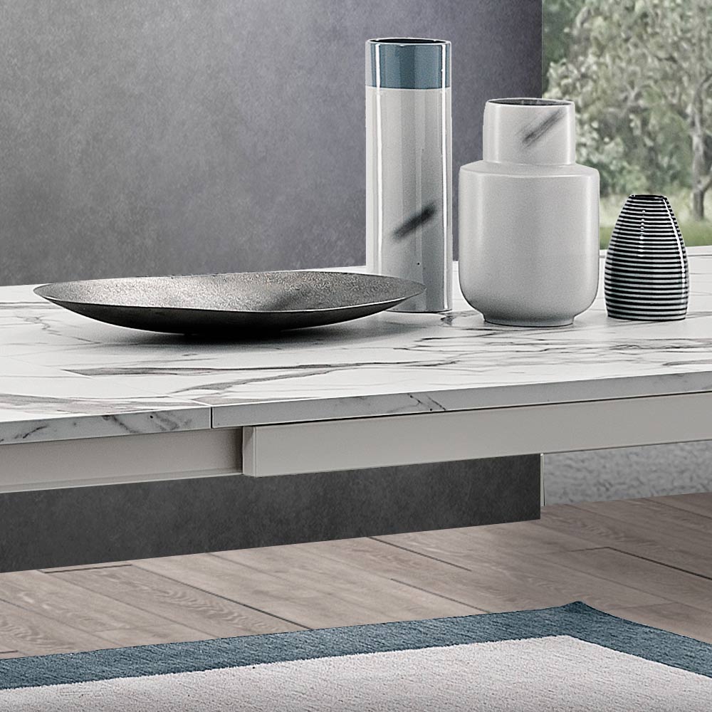 Extendable lounge table made with structure and legs in matt white RAL 9010 lacquered metal and top and extensions in cleaf melamine (22mm thick) calacatta finish, entirely Made in Italy.