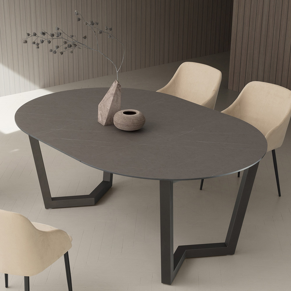 Dining table with top round , made in Italy in 10 mm thick stratified HPL with metal legs painted with epoxy powders, mocha finish. A furnishing accessory characterized by an elegant and sculptural structure that arises from the combination of materials of different nature together with the passion for workmanship.