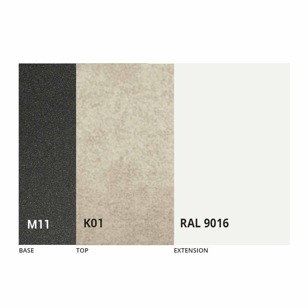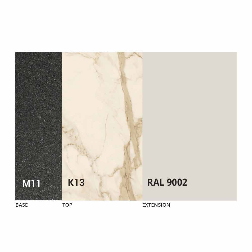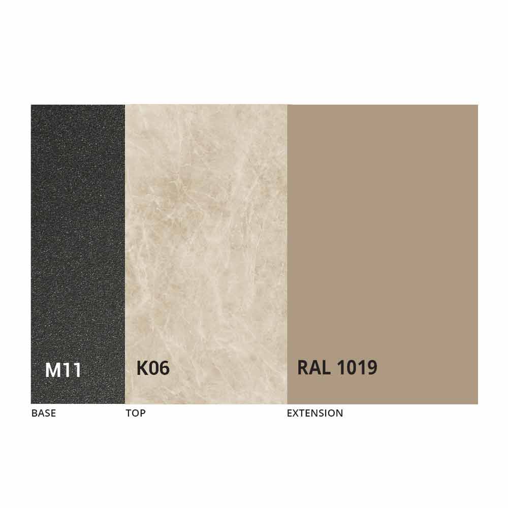 The top and base of the table can be customized with different materials and sample finishes or RAL lacquering. For information, contact us using the appropriate "