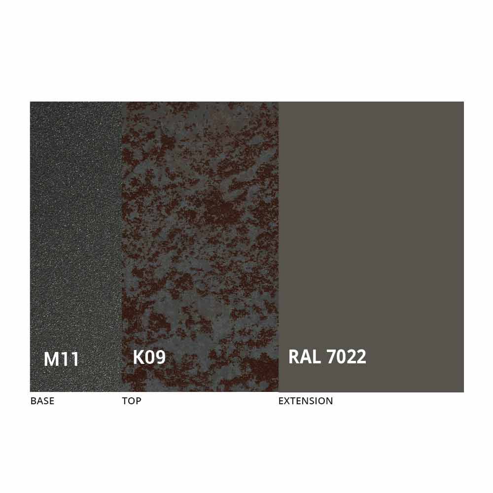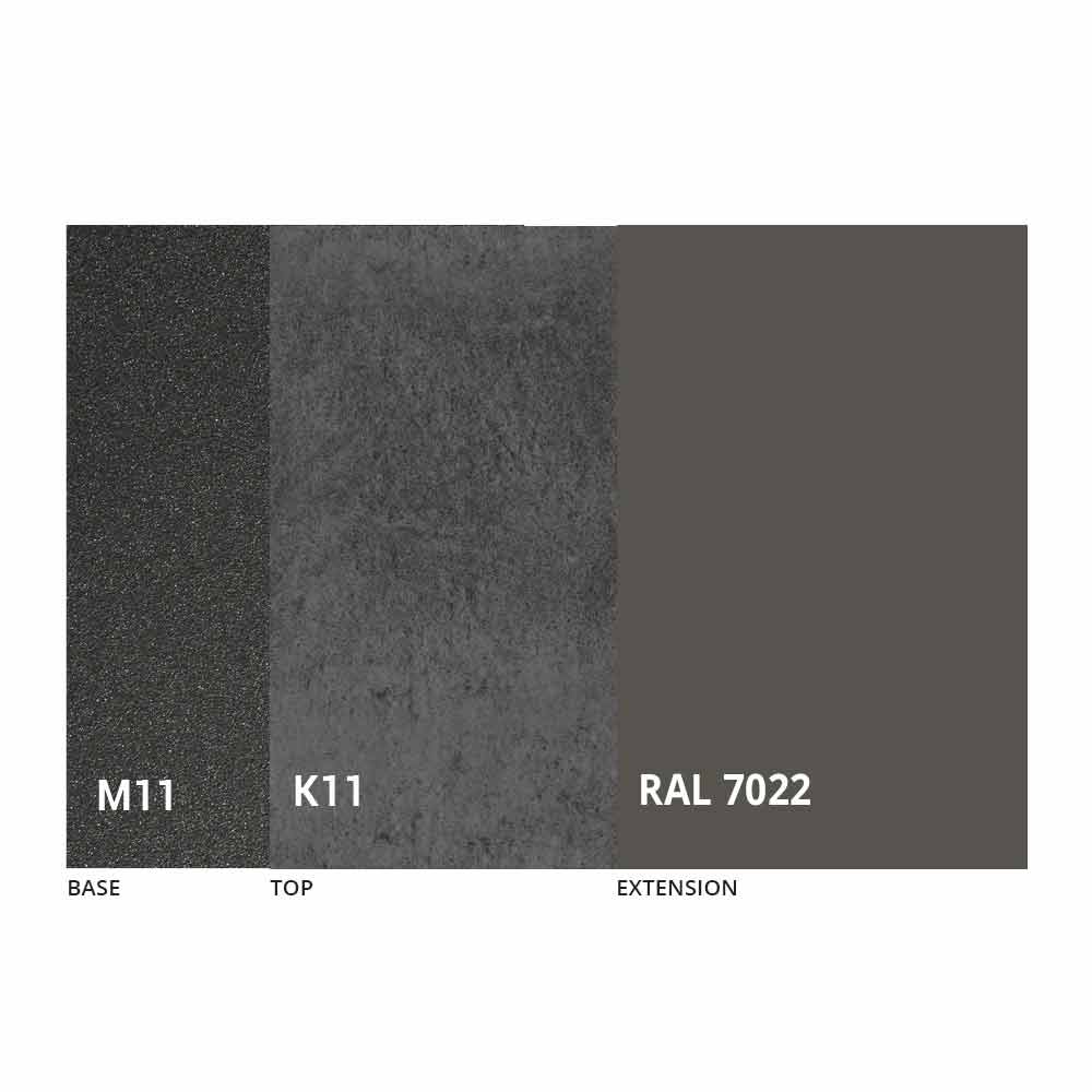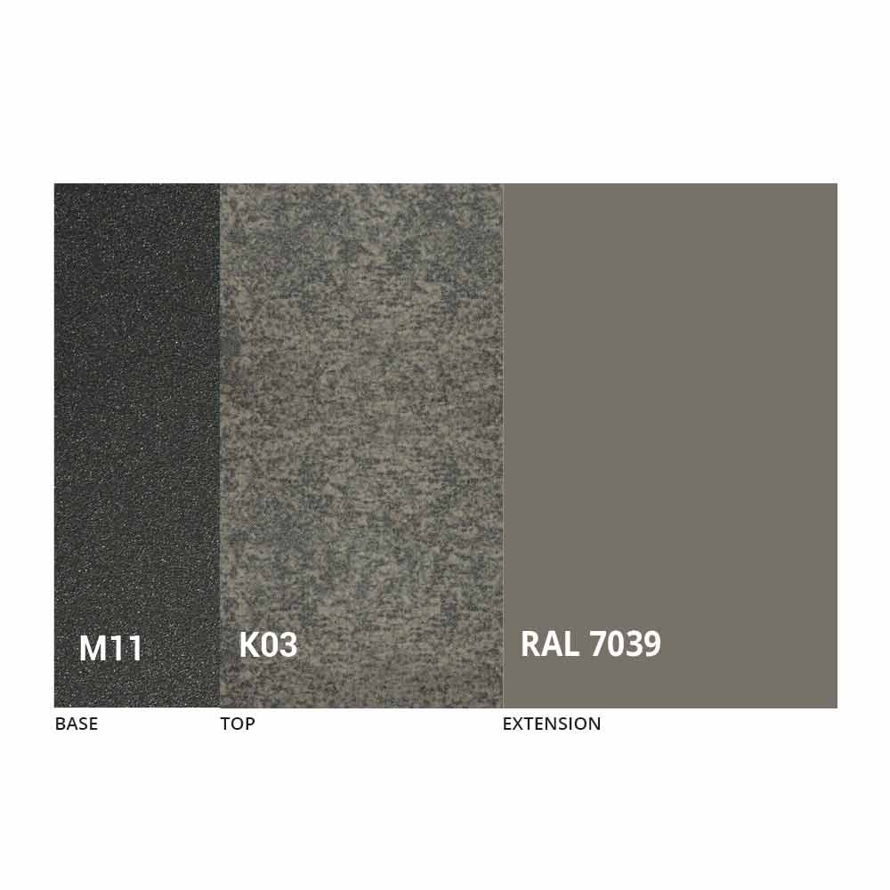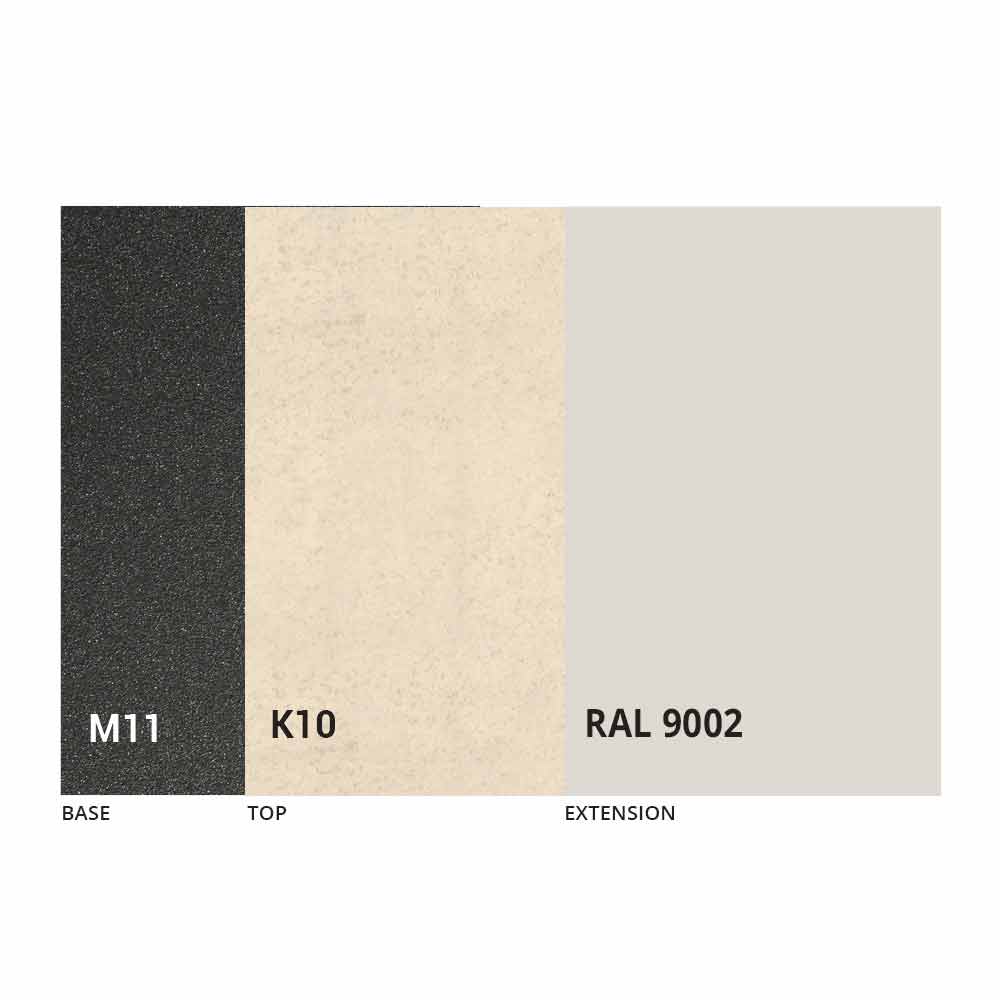 The top and base of the table can be customized with different materials and sample finishes or RAL lacquering. For information, contact us using the appropriate "