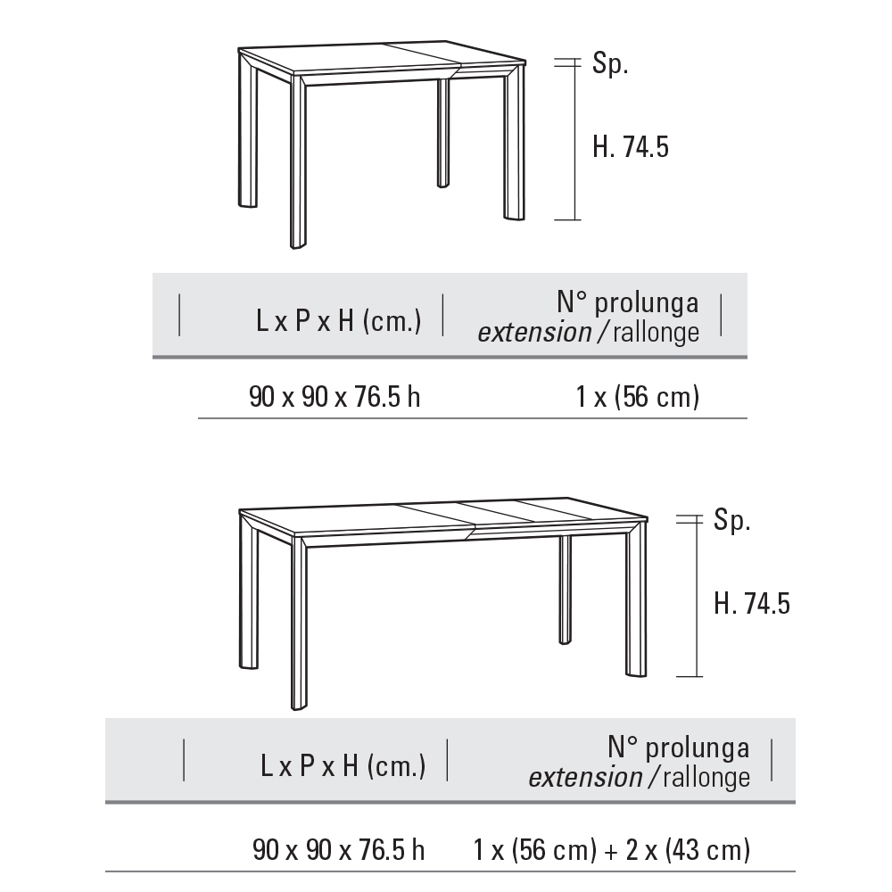 - L 90/232 x D 90 x H 76.5 cm (1 extension of 56 cm + 2 extensions of 43 cm).