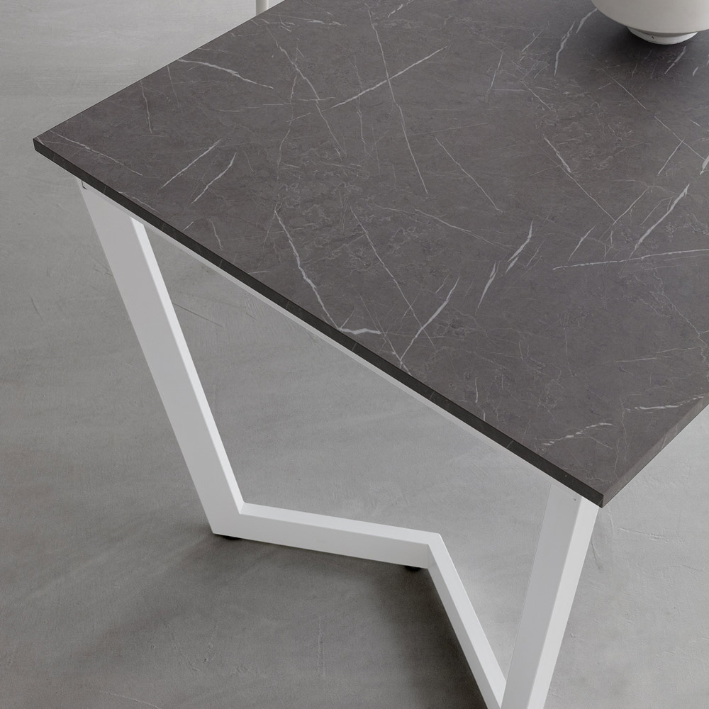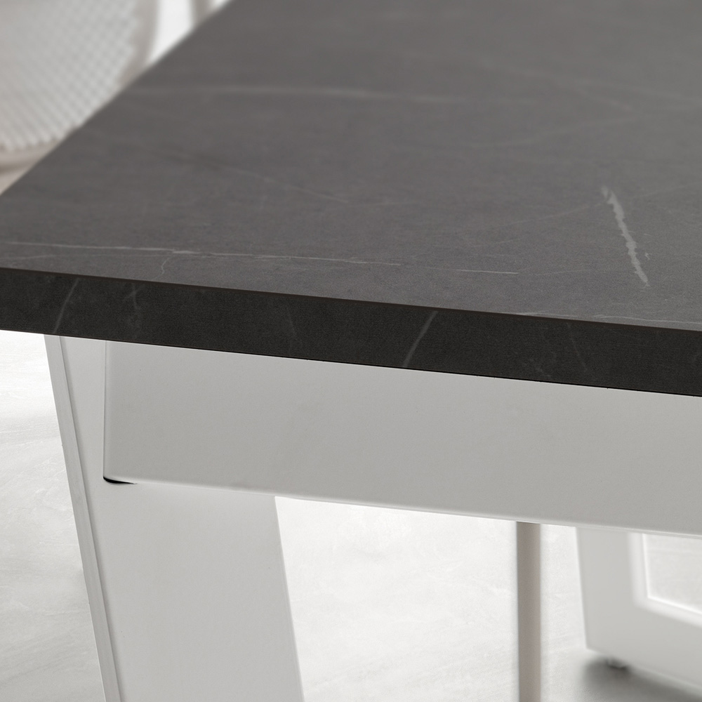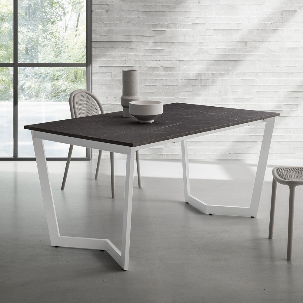 Dining table made in Italy with epoxy powder coated metal structure in white finish, extendable hpl top available in different finishes and in two different sizes. Its aesthetic focuses entirely on a functional and modern style , fundamental characteristics for creating an exclusive harmony within the room.