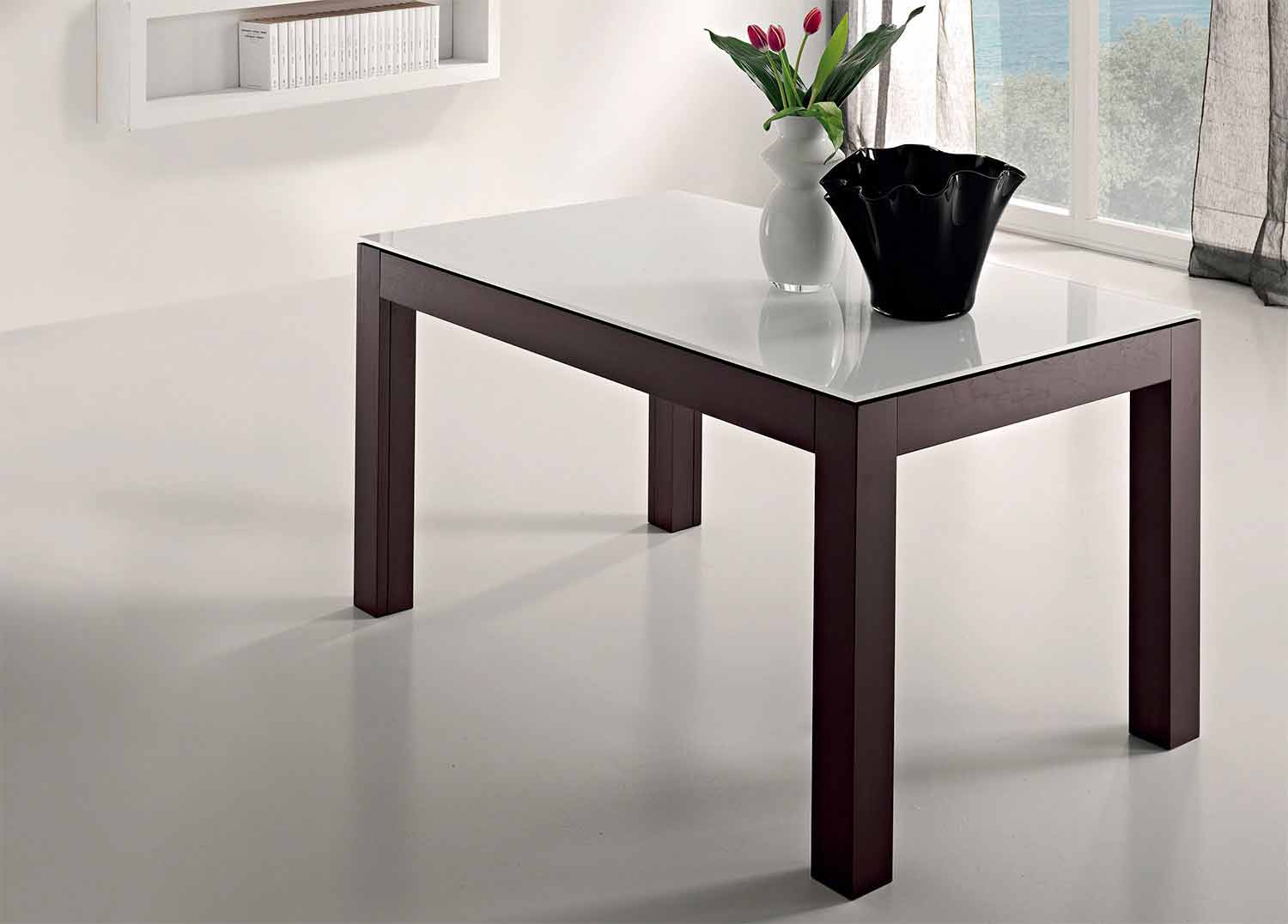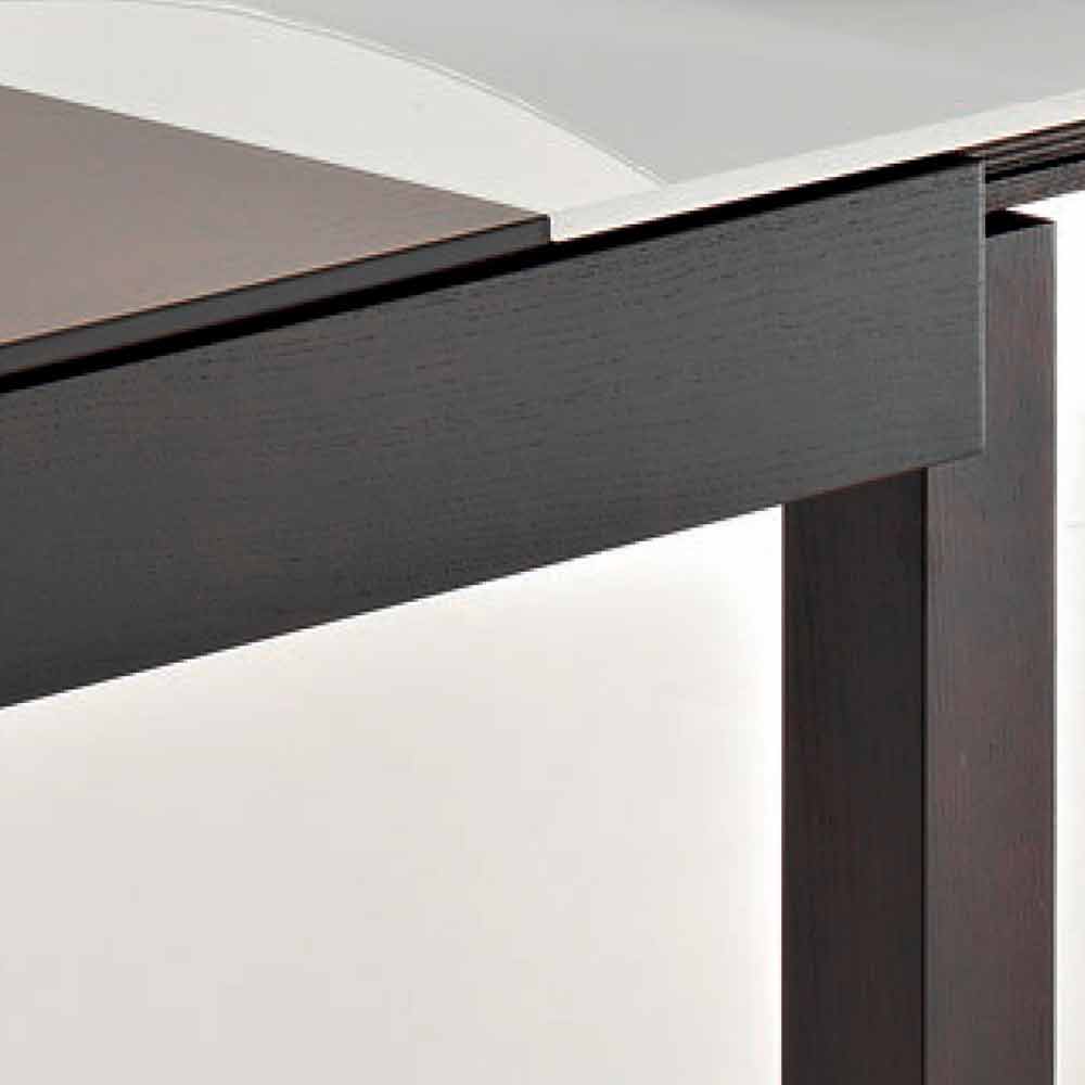 - top in extra-clear milk glass, extensions in ash veneered wood in wengè oak finish, legs in solid ash wood in wengè oak finish;