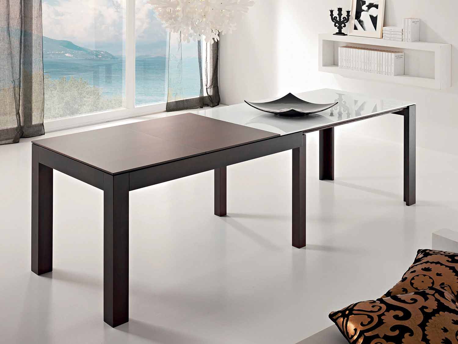 extra-clear milk glass top (10mm thick). The top becomes extendable through a lateral opening with wooden guides; inside there are 2 shelves of 60 cm each for the 150cm long table and, 2 shelves of 50cm each for the 130cm long table. The shelves (