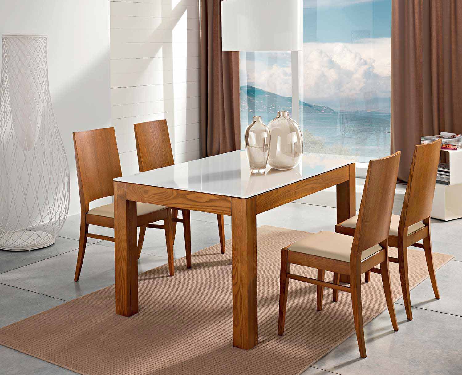 - top in extra-clear milk glass, extensions in wood veneered with ash sand oak finish, legs in solid ash wood with sand oak finish;