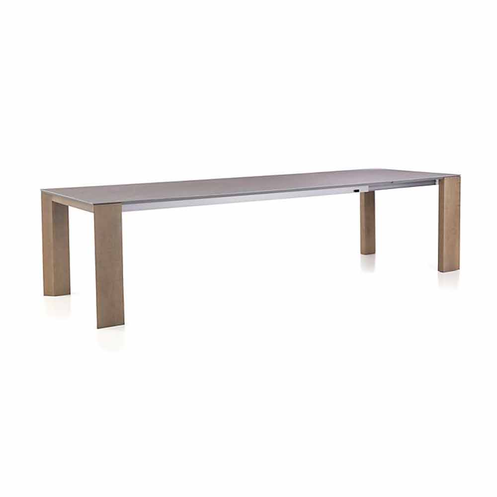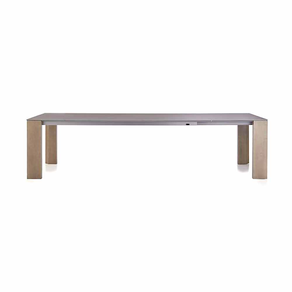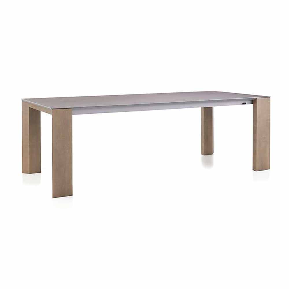 The idea of this type of collection of tables, with really important measures up to 300 cm in length, is to offer an easily reachable extensibility service. Elegance is also present in an elongated position. This simplicity in the extensibility function is made possible through the use of an aluminium frame with integrated guides, combining noble traditional materials such as wood and ceramics through a contemporary design that lasts over time.