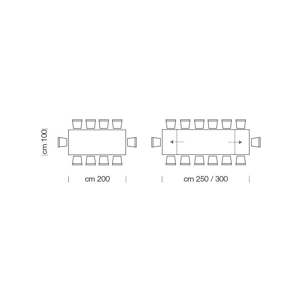 - L 200 (300) x D 100 x H 76.5 cm 14 seater extendable with two 50cm external extensions.
