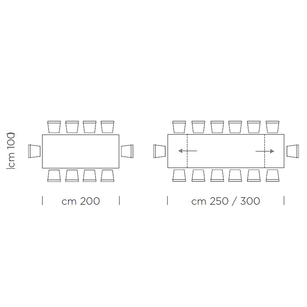 - L 200/300 x D 100 x H 75.5 cm 14 seats (2 extensions of 50 cm).