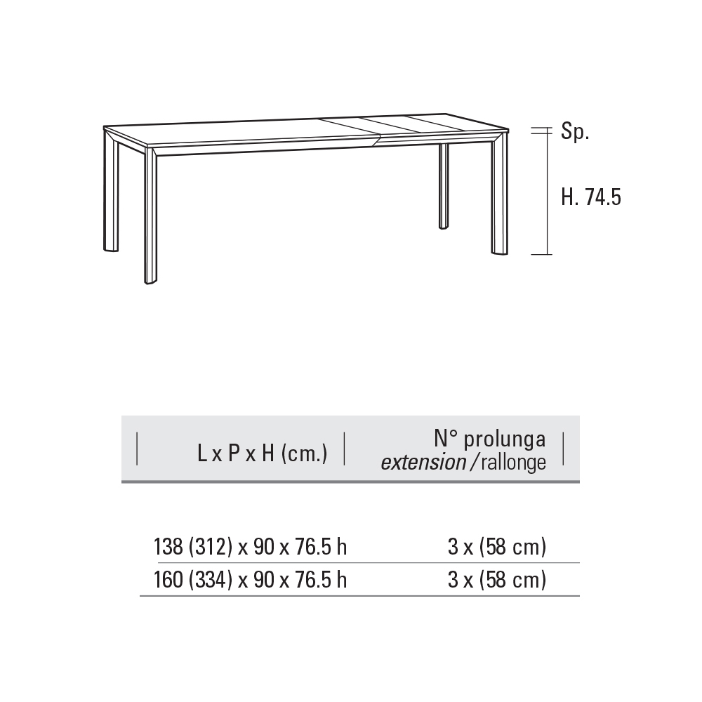 - L 160/334 x D 90 x H 76.5 cm.