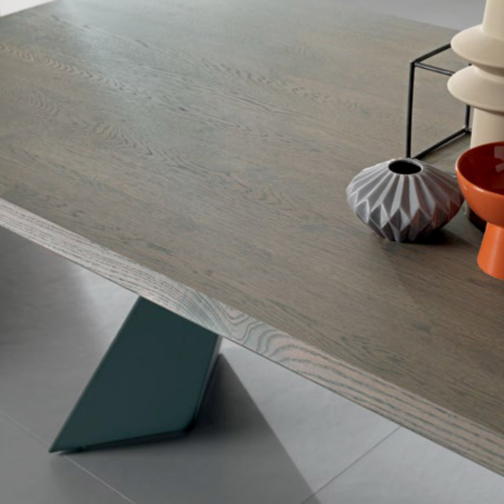 This table combines architectural creativity and contemporary sophistication , transforming any room into a stylish space . The oak veneer top expresses all the beauty of the natural grain , while the thin, slightly sloping edge lends visual lightness and a touch of modernity.