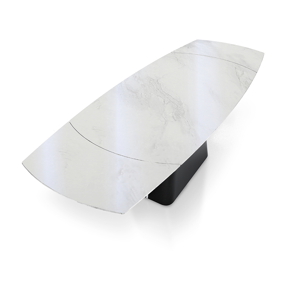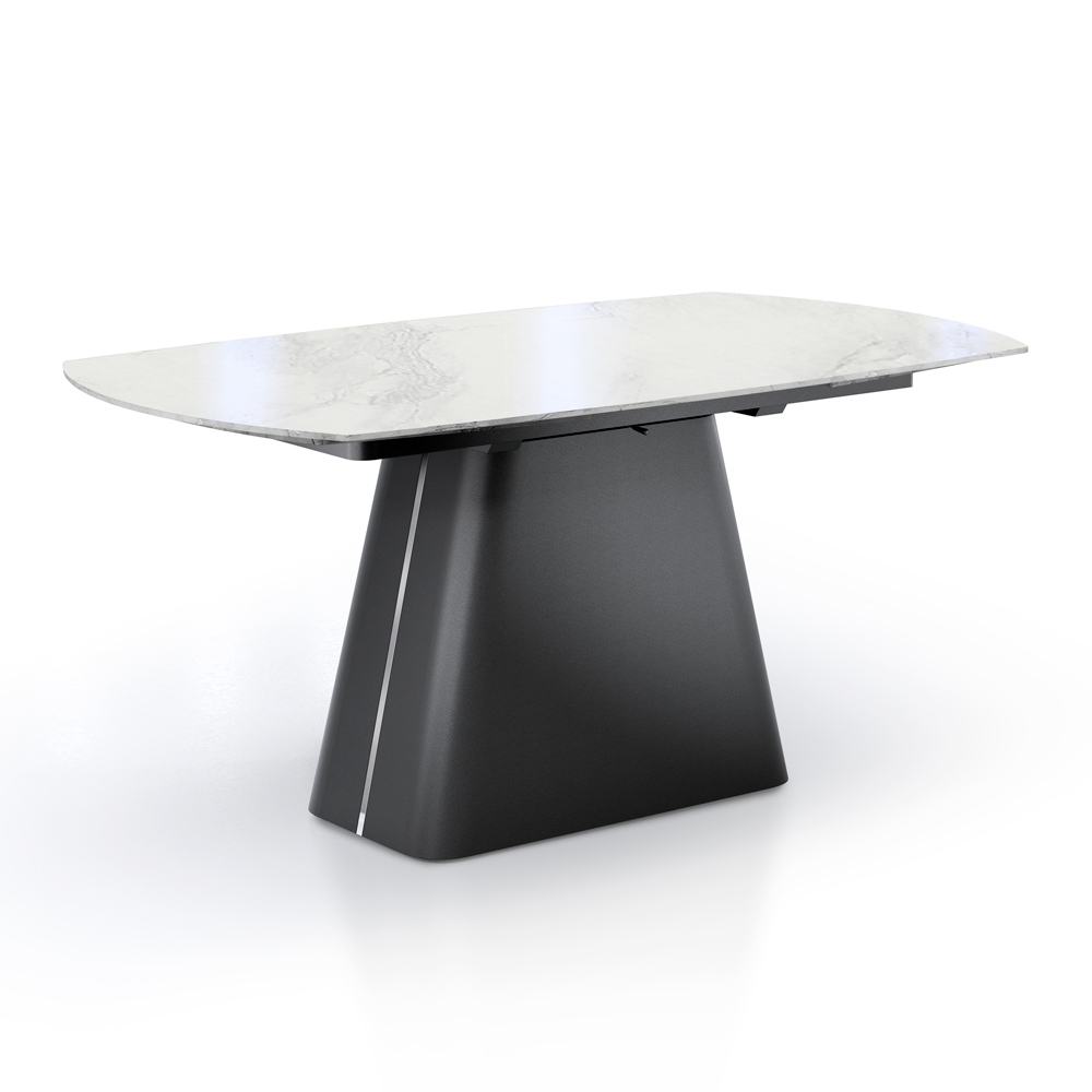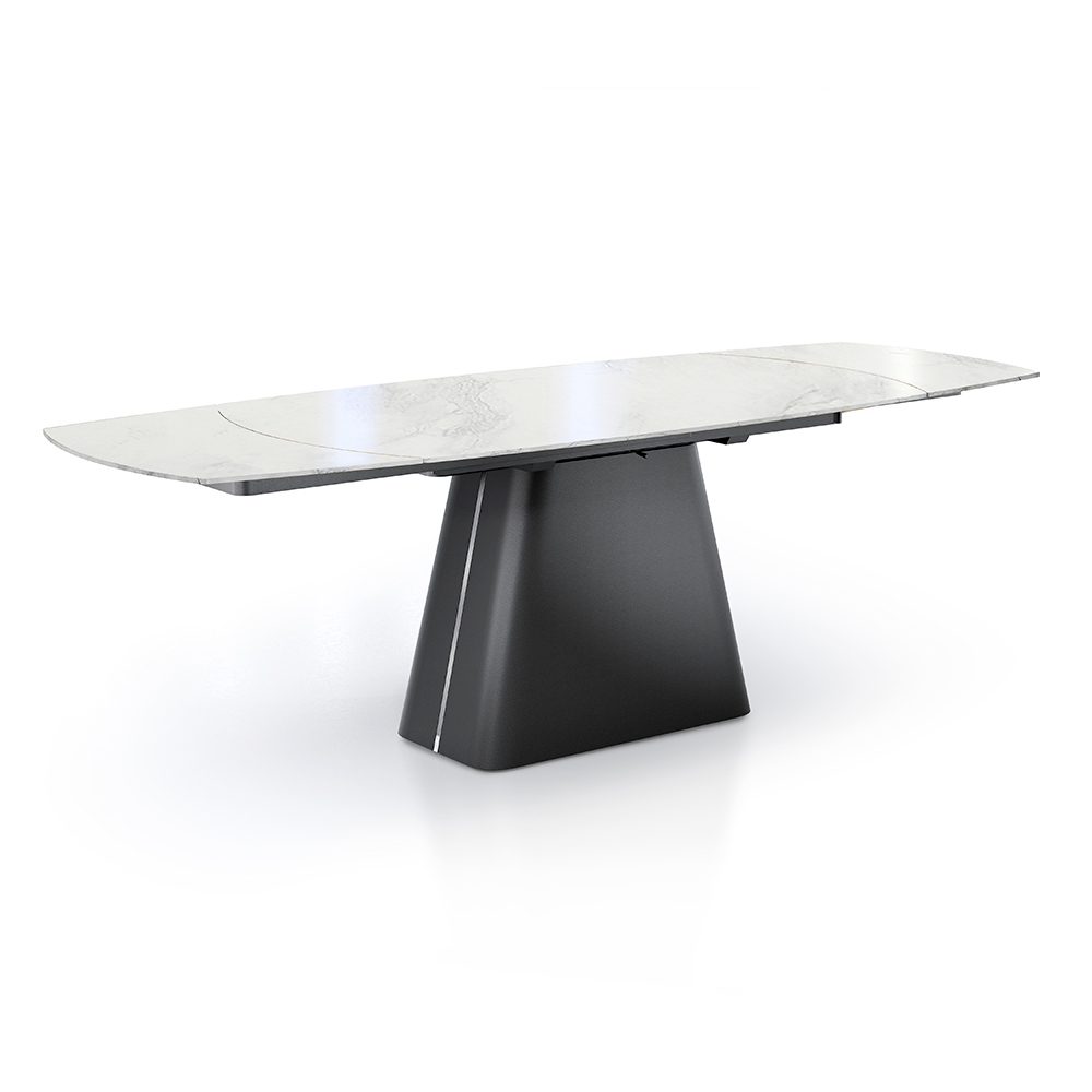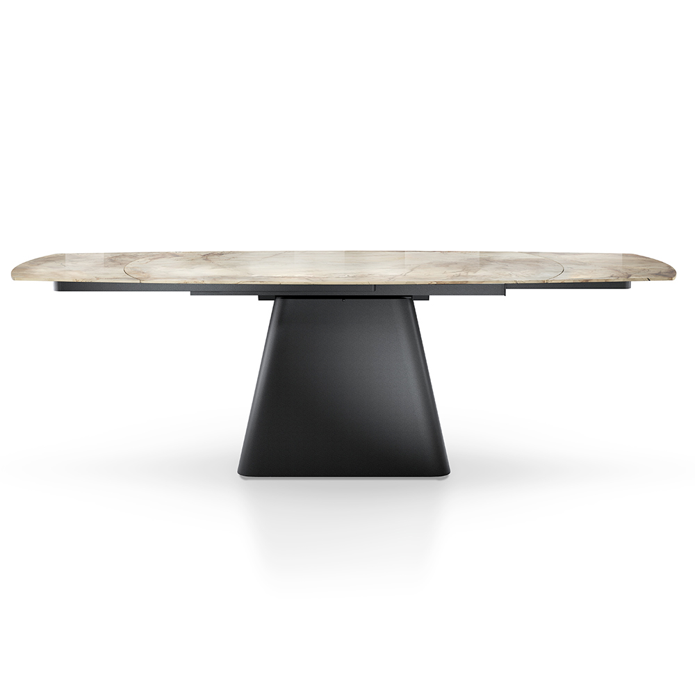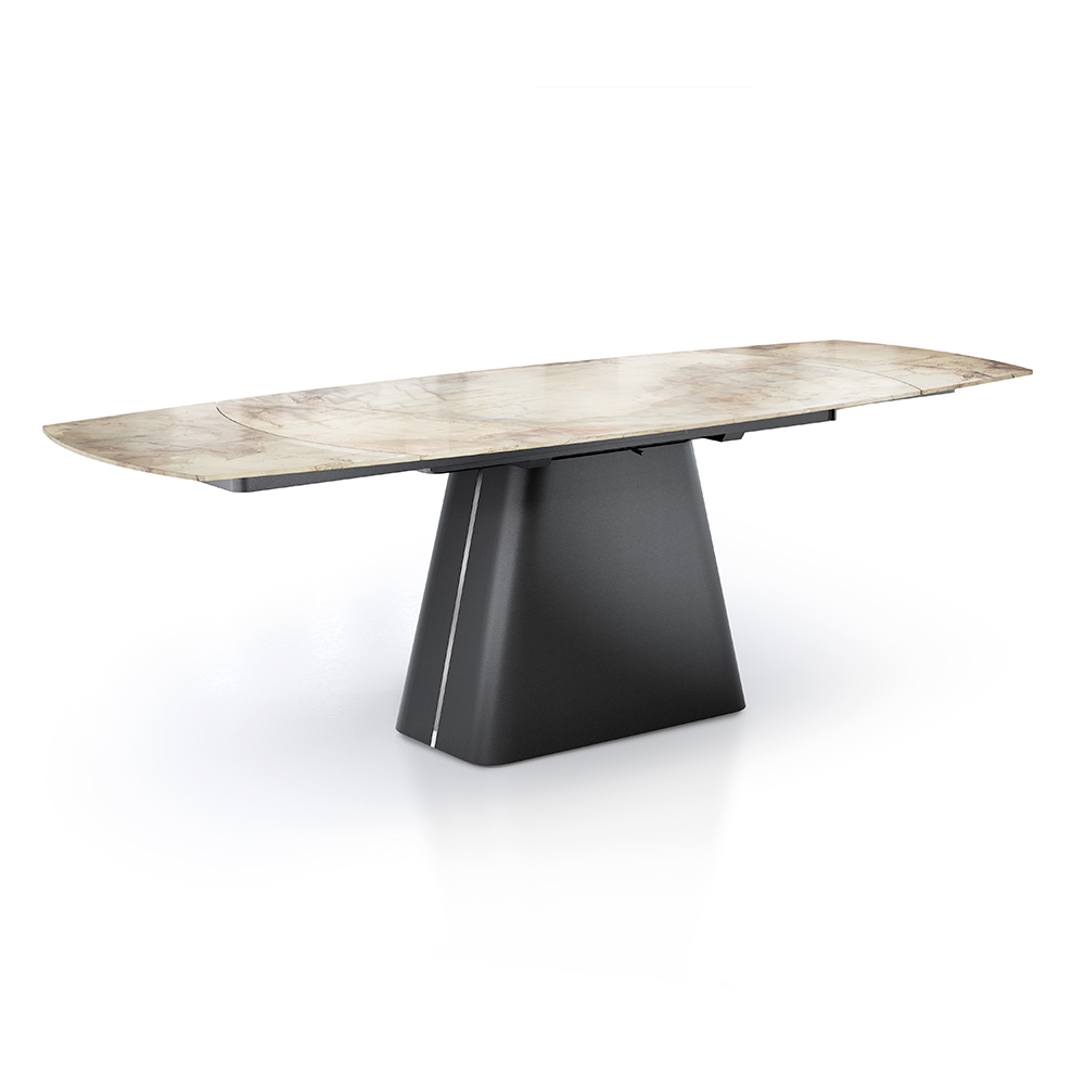 This extendable table is a masterpiece of design and functionality, ideal for those who want to combine elegance and versatility in a single piece of furniture. The surface sits on a sturdy and stylistically bold black metal base, offering a stunning visual contrast that is an eye-catcher in any dining room.