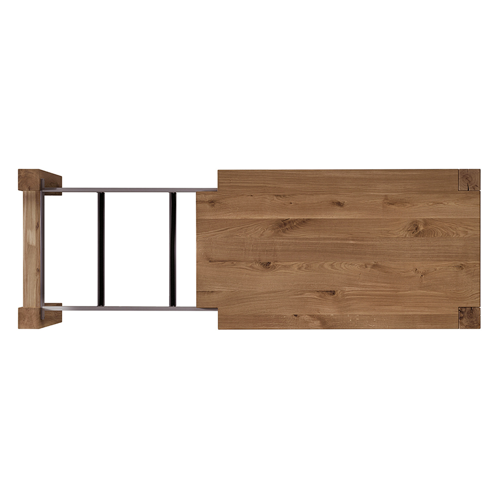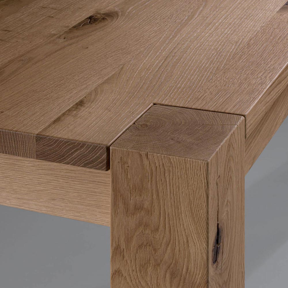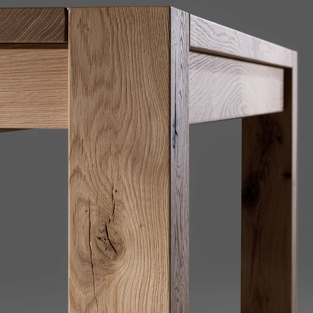Extendable table with natural split oak veneered blockboard top and laminated veneered legs , 12x12cm. Extensions are included .