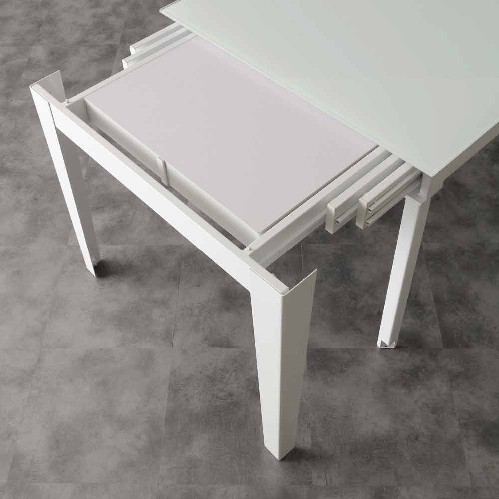Baltimora comes with four extension leaves, that can be easily stored inside the table top. The extensions are made of melamine panel and match the glass top.