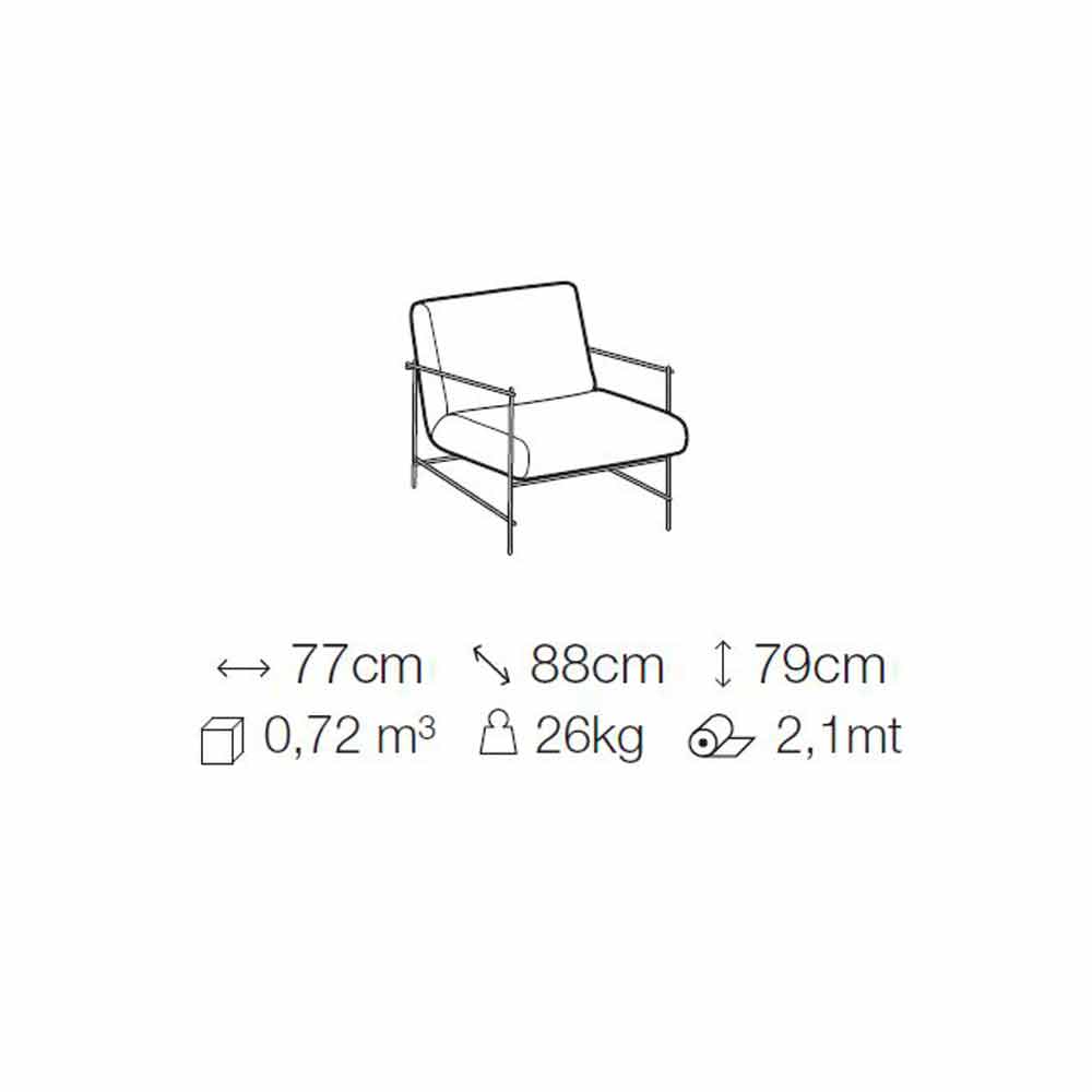 painted metal structure , shell in blockboard wood panels and cushions upholstered in non-deformable polyurethane foam covered in Tecnoform. Seat and back in completely removable
