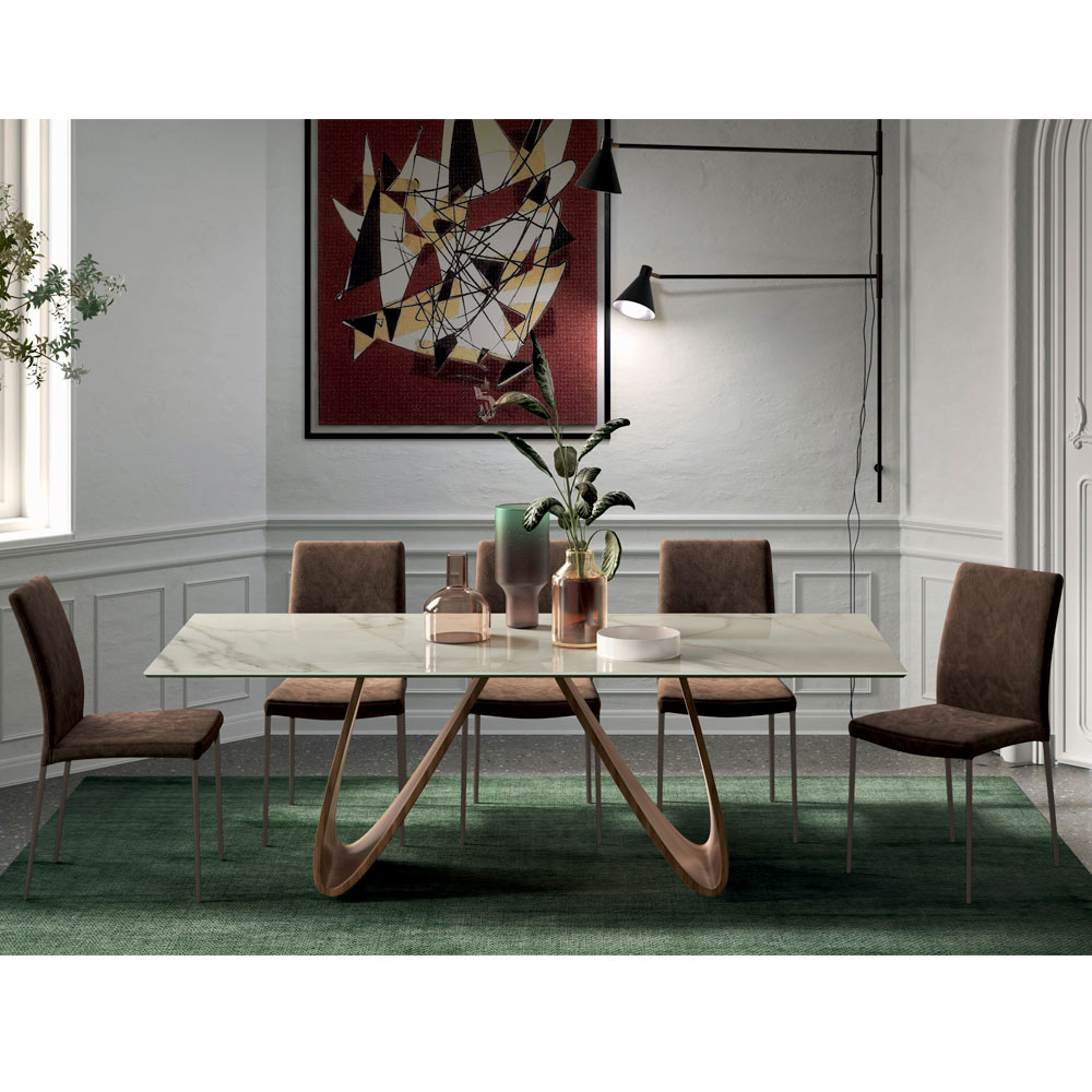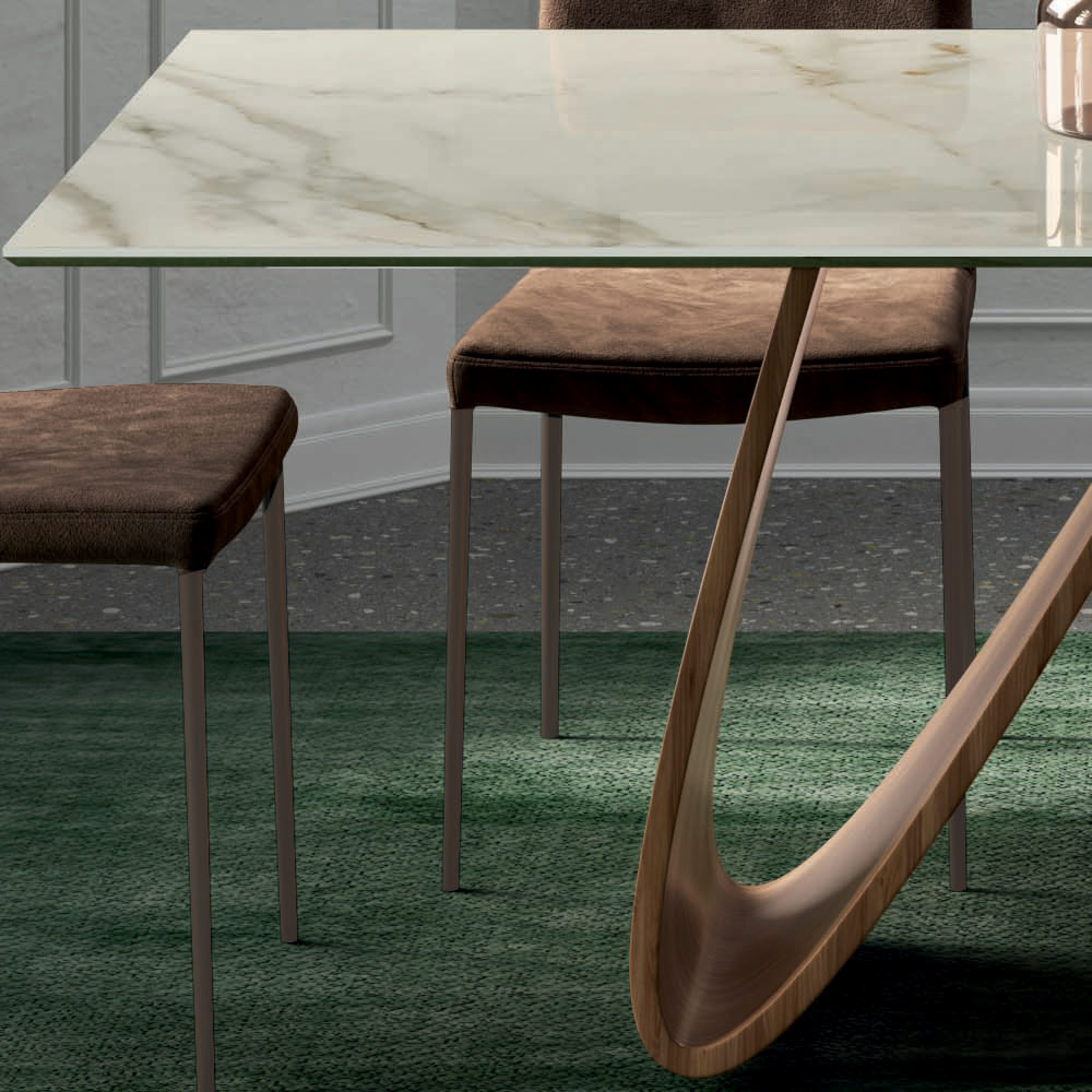 Thanks to the shape of the base and the available top finishes, the table is capable of giving a