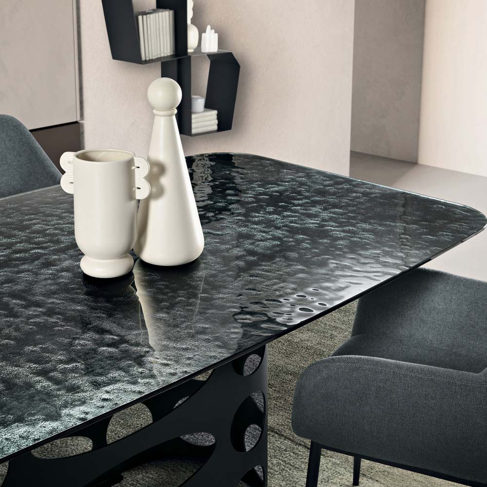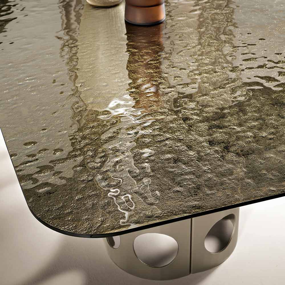 The hammered glass top gives the table depth and personality thanks to its unique textured finish that reflects light in an irregular pattern, creating striking visual effects. This process makes each surface dynamic and refined, enhancing the product's contemporary design.