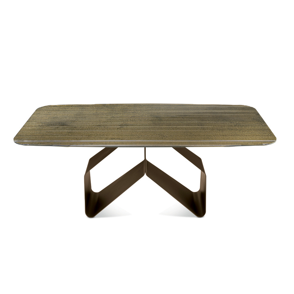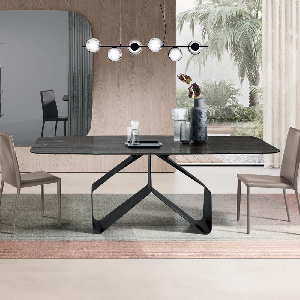 An elegant, Made in Italy designer dining table designed to stylishly furnish your dining room or living area . The table stands out for its original painted metal base , featuring a light and dynamic graphic structure reminiscent of two stylized wings, creating a strong aesthetic impact while maintaining great visual balance.