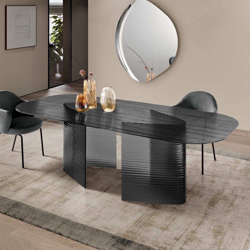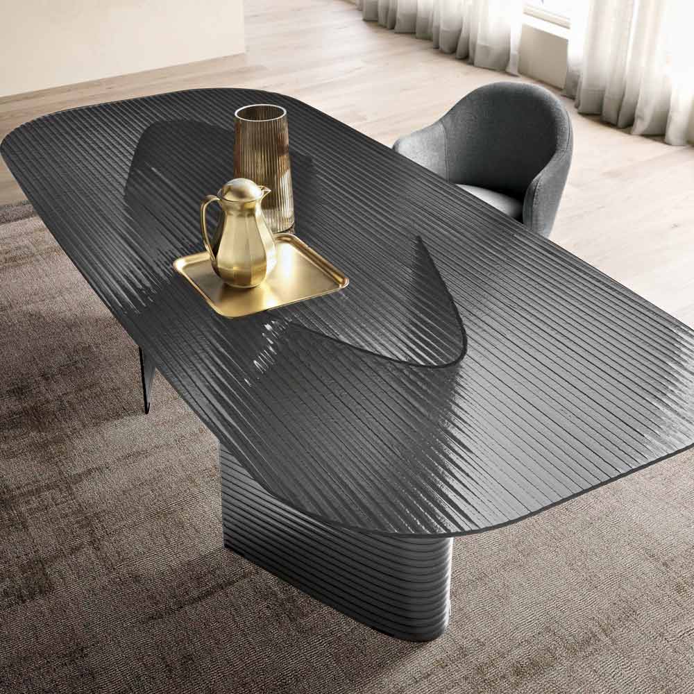 An elegant, Made in Italy designer dining table featuring a refined, contemporary style, ideal for adding personality to your dining room or living room . Crafted entirely from clear, ribbed glass , this table brightens any room, creating captivating plays of light and reflections.
