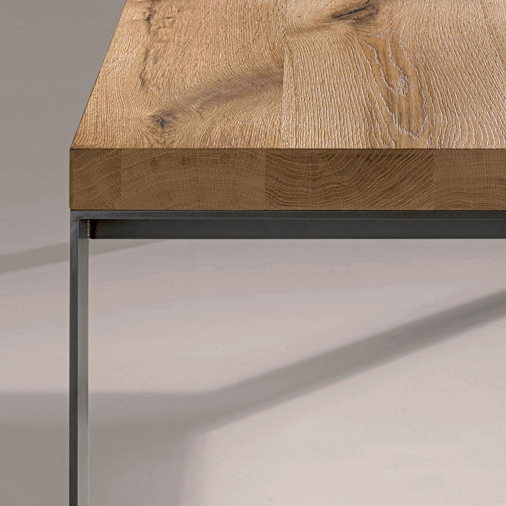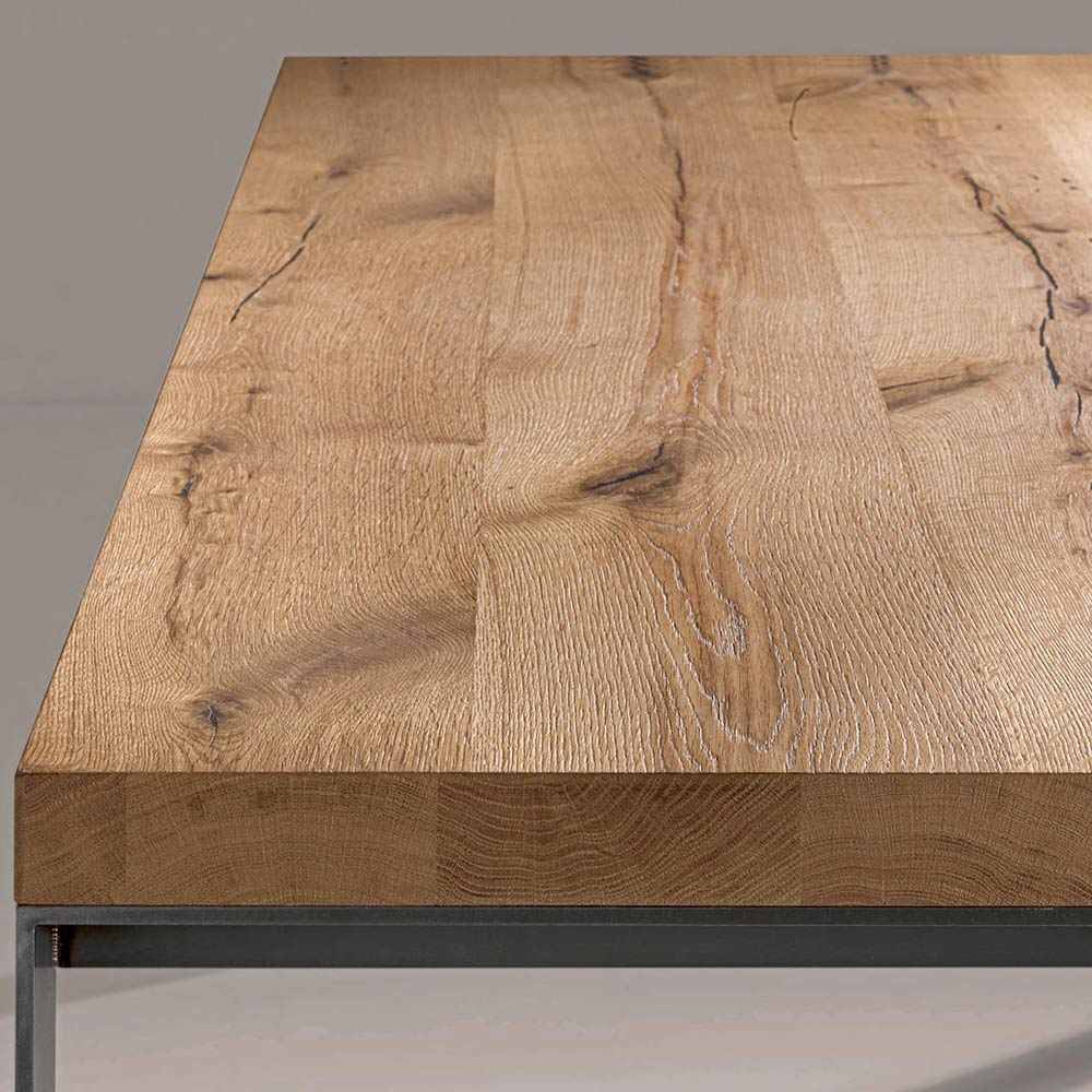 Fixed table veneered on natural split oak poplar chipboard with iron finish metal legs . Dimensions H 78 cm, thickness 6 cm.