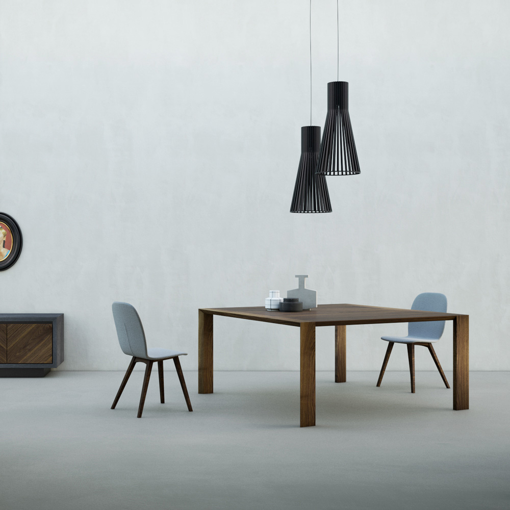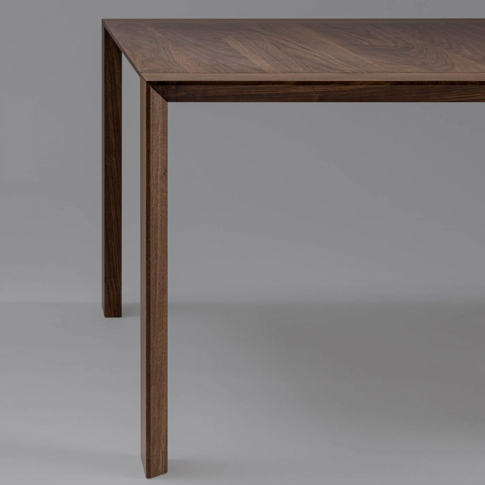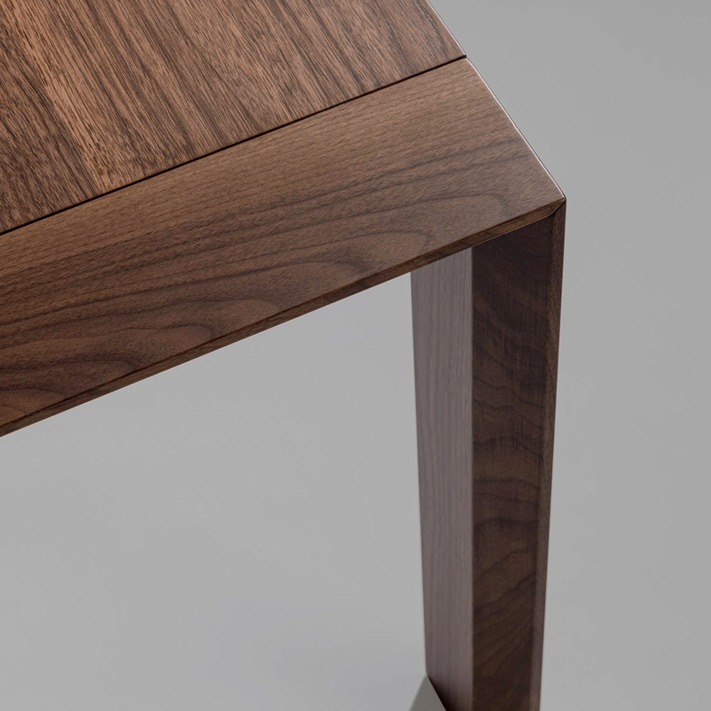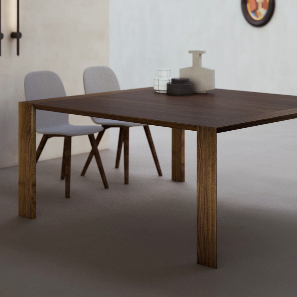 Fixed table with bevelled legs veneered on laminate and top veneered on poplar chipboard in canaletto walnut colour .