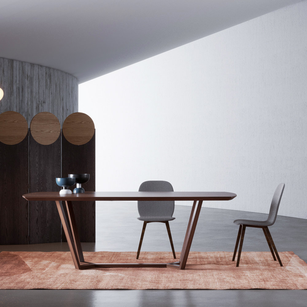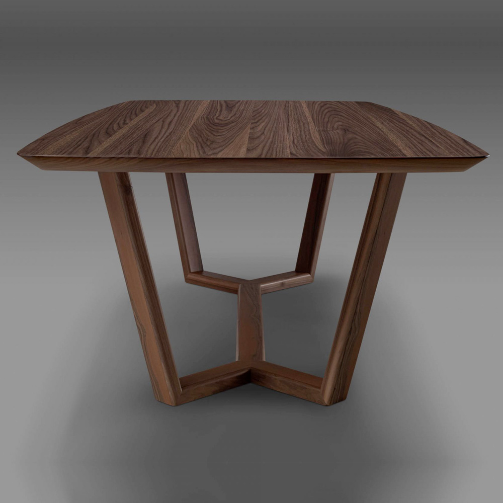 Fixed table with shaped and bevelled top on canaletto walnut veneered blockboard and solid wood base.