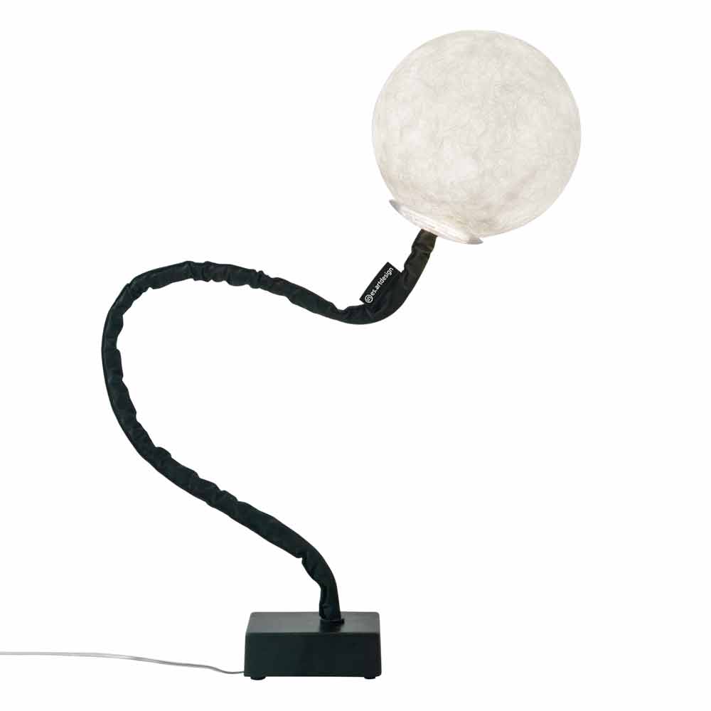 The structure of the modern Micro Luna floor lamp is flexible and adjustable and is made of cast iron and steel, while the luminous sphere is made of NebuliteĀ® , an innovative material composed of resin and fibre, whose veins give the lamp a particular effect " lunar".