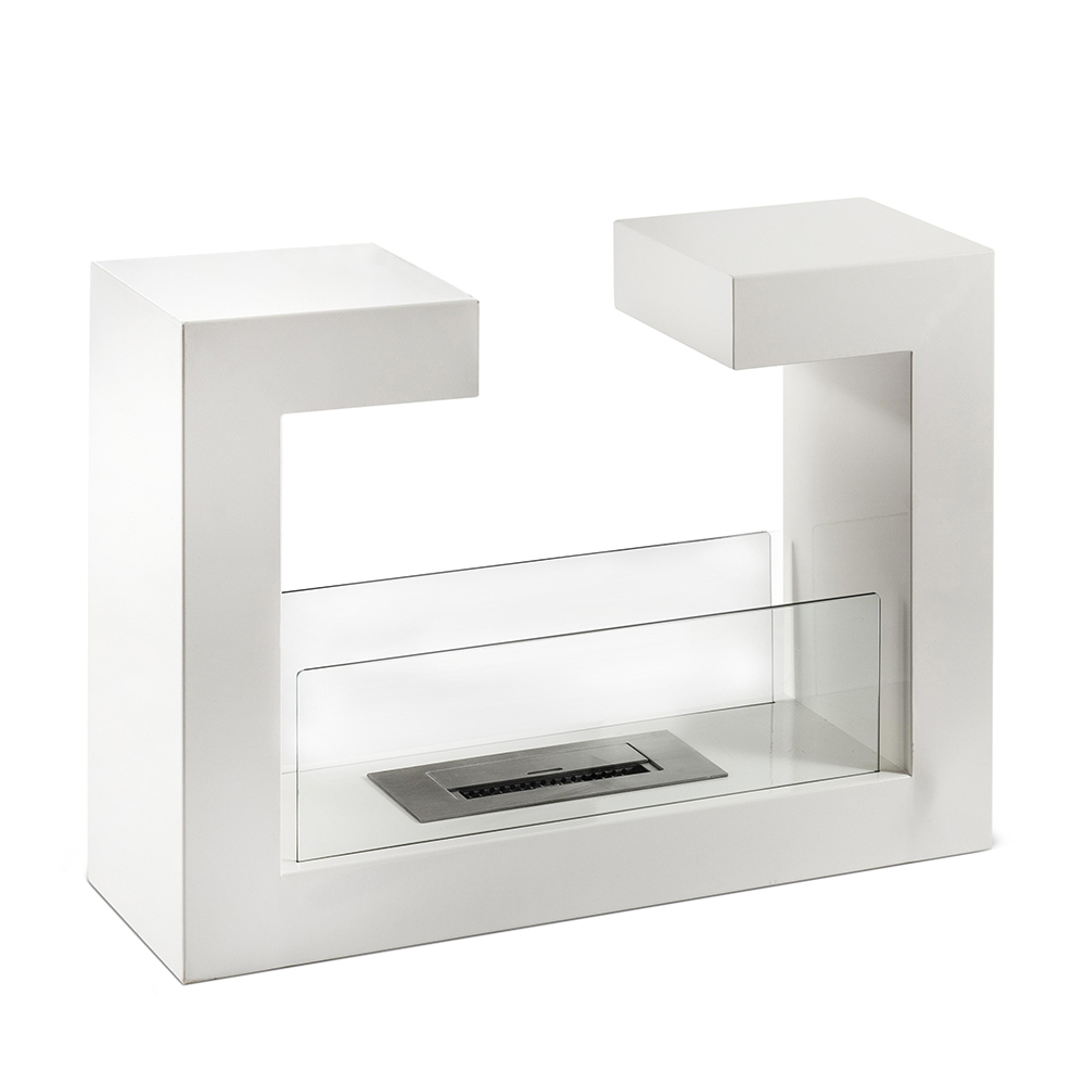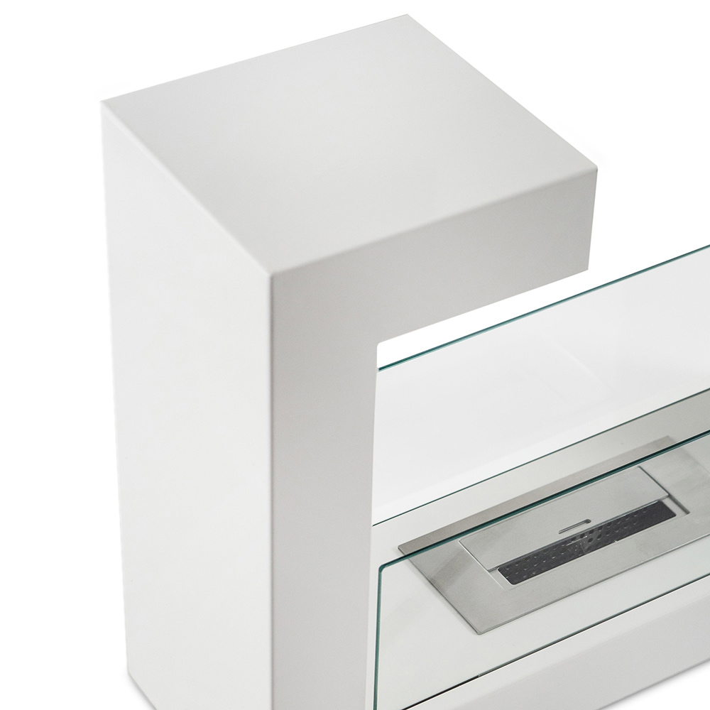 Floor-standing biofireplace in white metal and transparent tempered glass.
