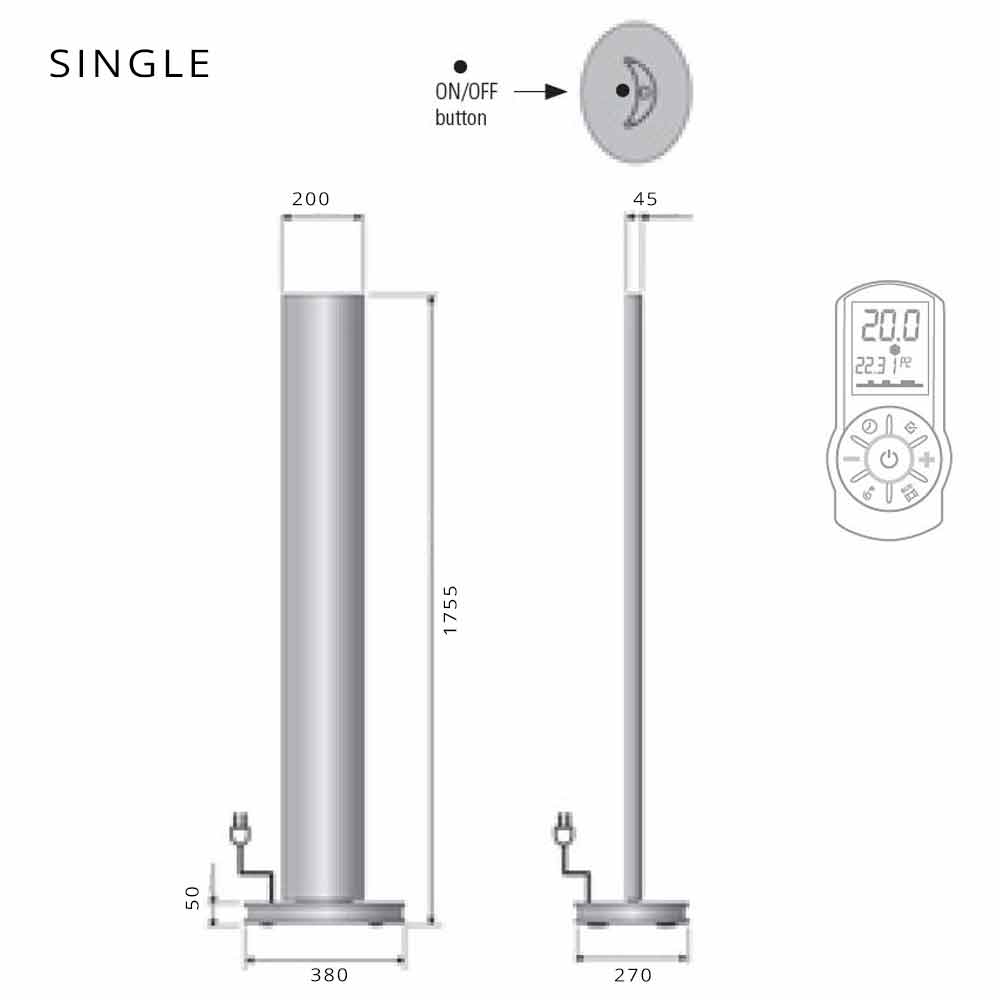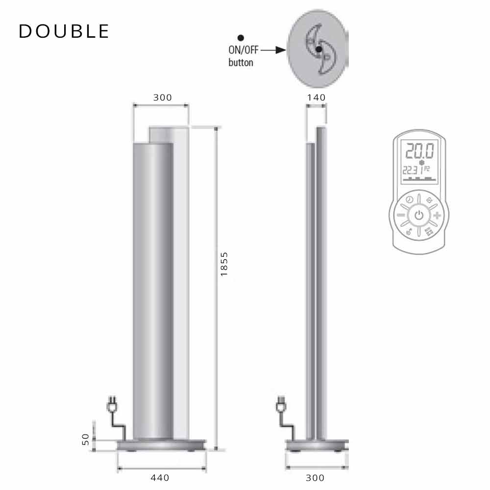 This heater has 250 watts of power for the single version and 500 watts for the double version, supplied with standard remote control for adjusting the LED lights and the thermostat with daily / weekly programming. 1.5 metre cable with schuko plug. 230 Volt single-phase power supply.