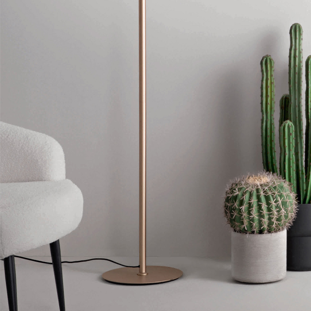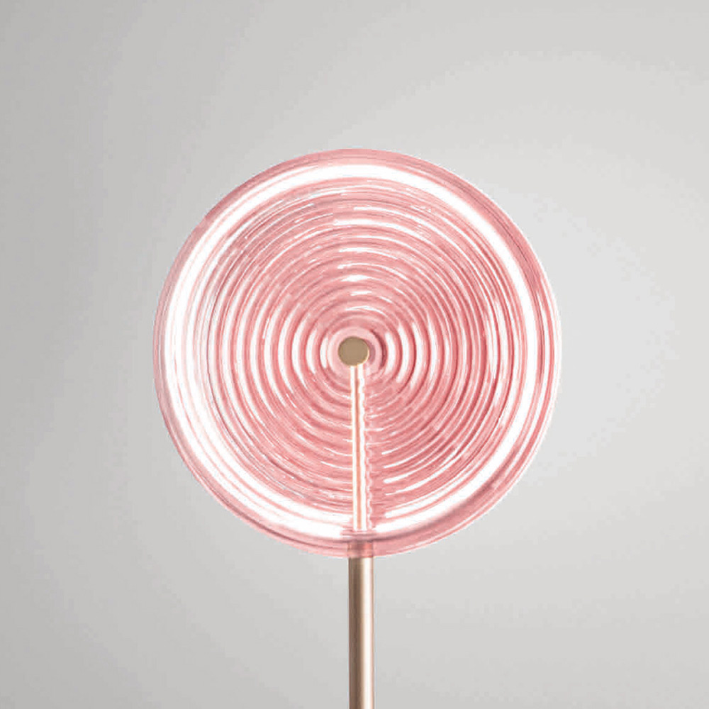 Floor lamp entirely produced in Italy made of gold finish painted metal, glass decorated with pink concentric lines with dimmable LED light.