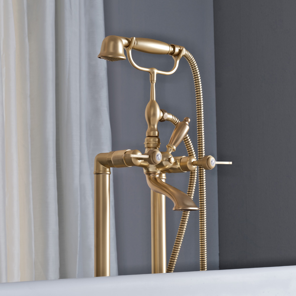 Floor-mounted bathtub assembly with hand shower and flexible, made of heavy brass, cast in moulds that respect the craft systems of the past and protected with a thick layer of finish matt brass.