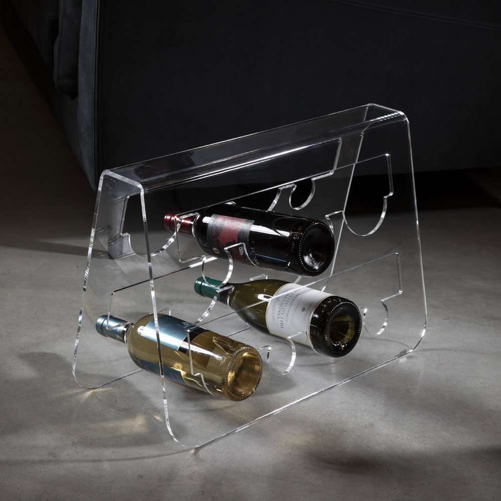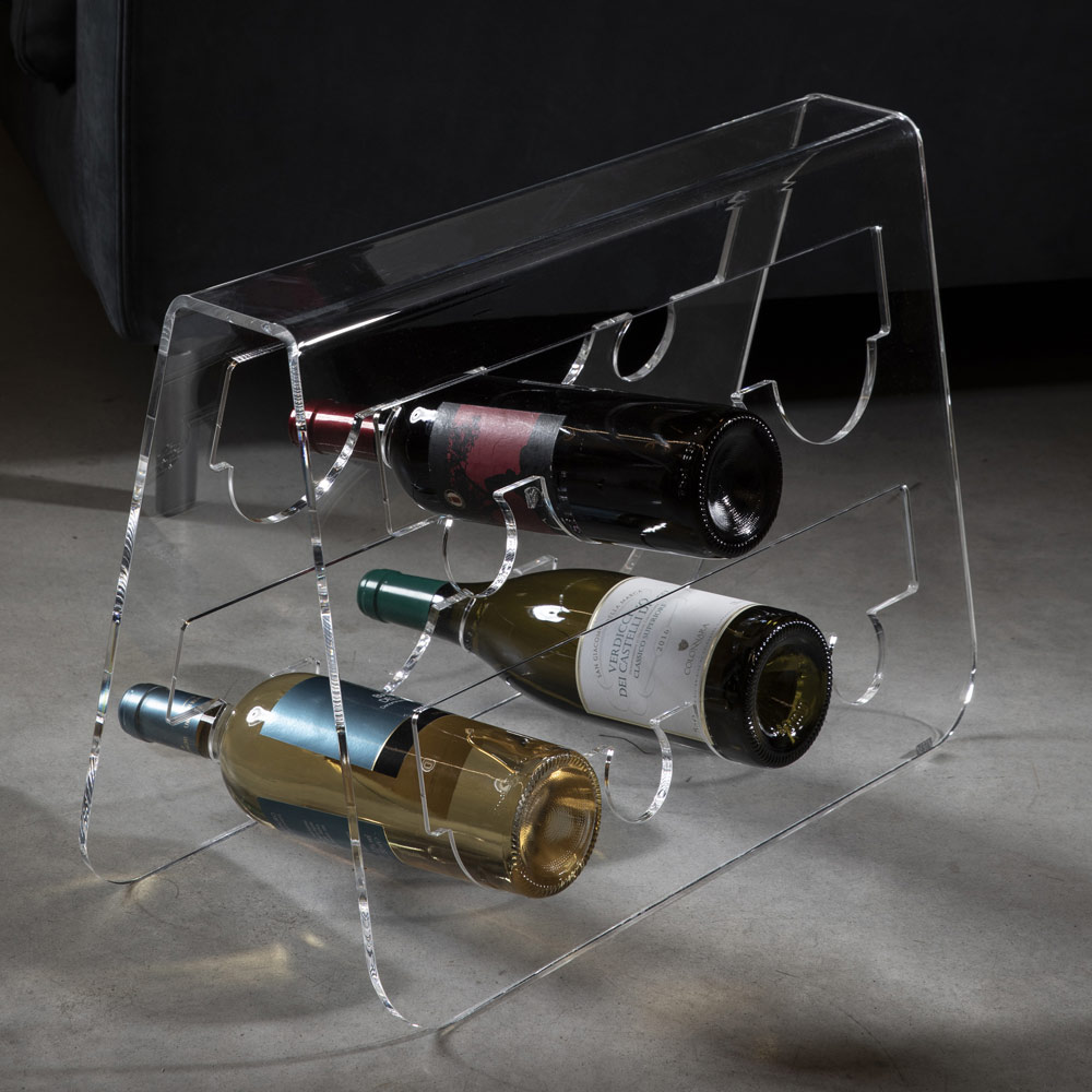 The free- standing wine bottle holder is characterized by an elegant design made entirely of transparent acrylic crystal.