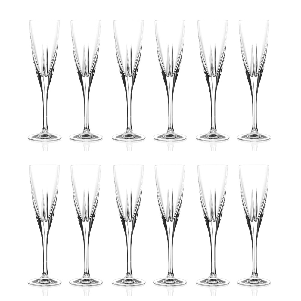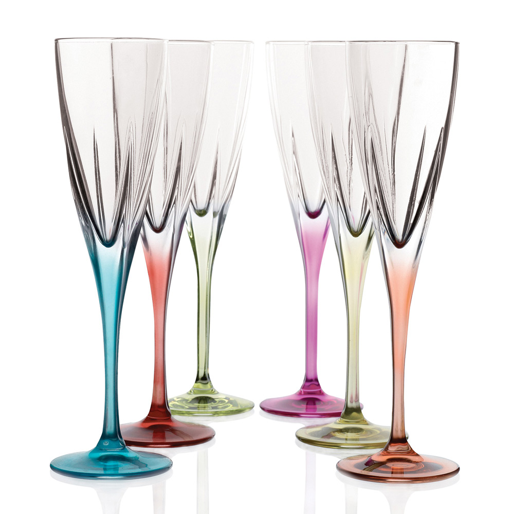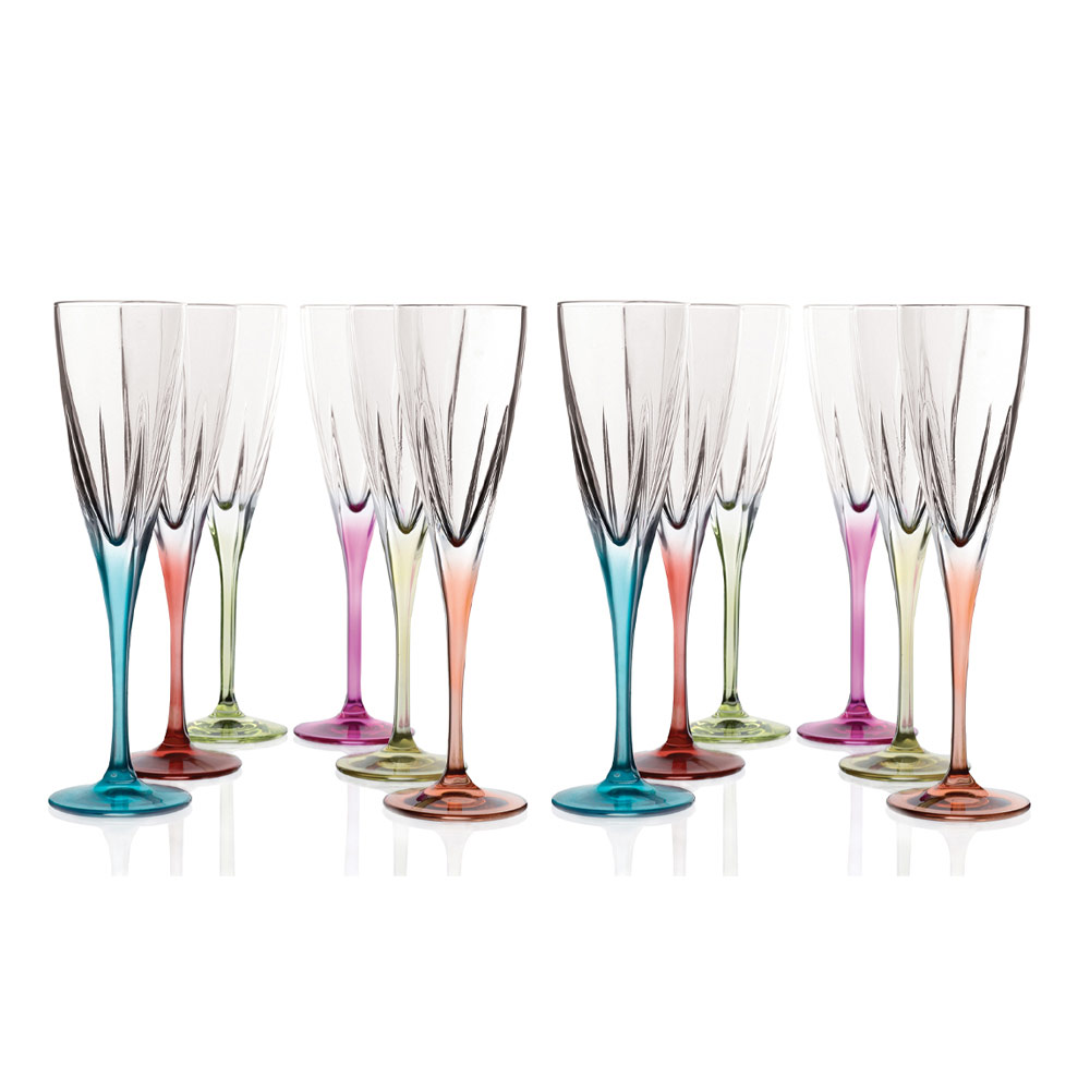 Set of flute glasses in transparent or colored eco crystal, 12 pieces made in Italy.