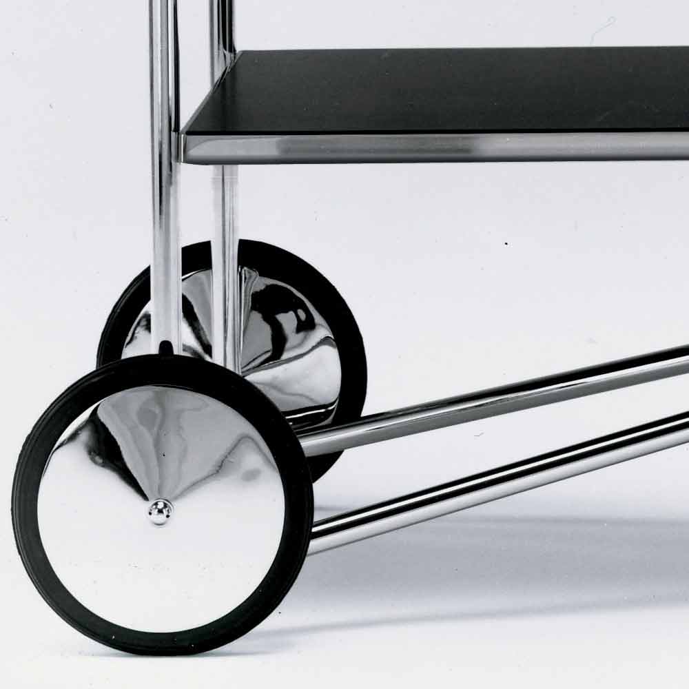 Food trolley with chromed steel structure equipped with 3 wheels and two shelves in black finish laminate. Practicality and design come together to give life to a highly functional and auxiliary piece of furniture in the home environment whose use is facilitated even more by the practical wheels that allow it to be moved quickly and easily. In addition to a purely functional side, this food trolley offers an innovative and refined aesthetic ideal for those who want to complete their furniture with a touch of new style .