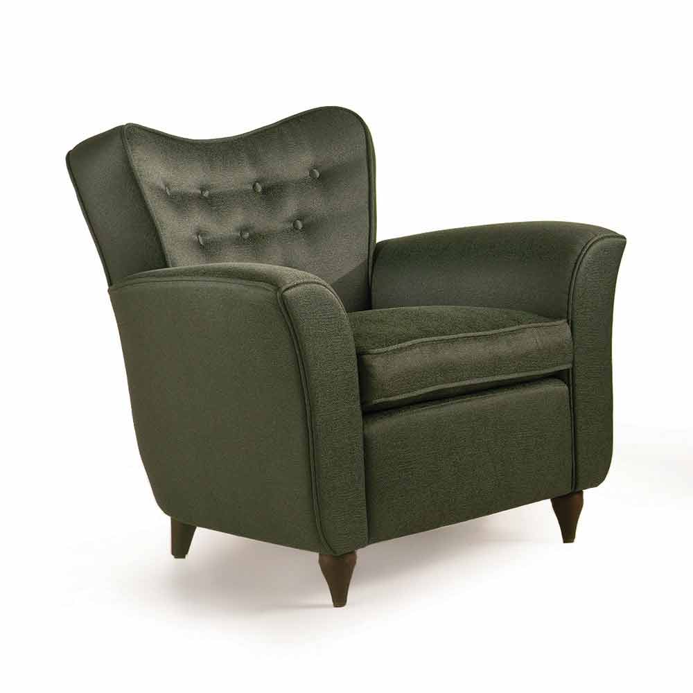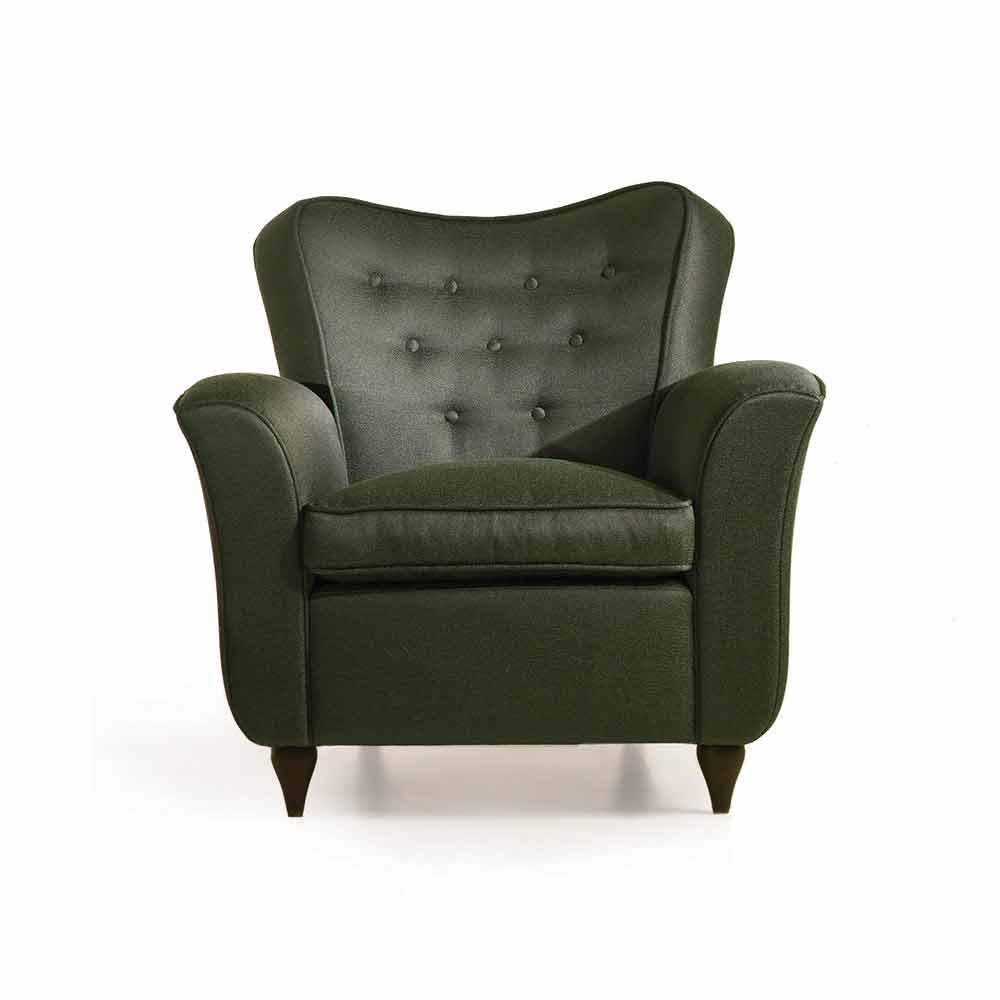 Upholstered armchair with capitonnè back, feet in matt dark walnut finish, fabric DD Artemis 15013/025.