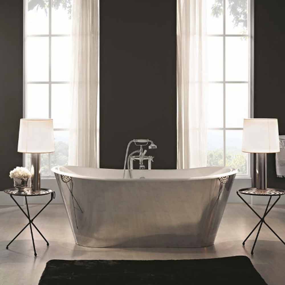 Freestanding cast iron bathtub plated externally in Sharon steel