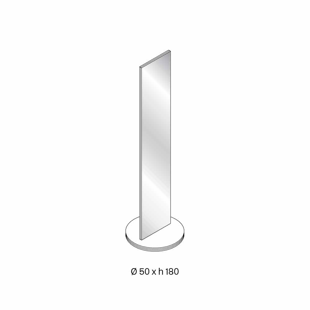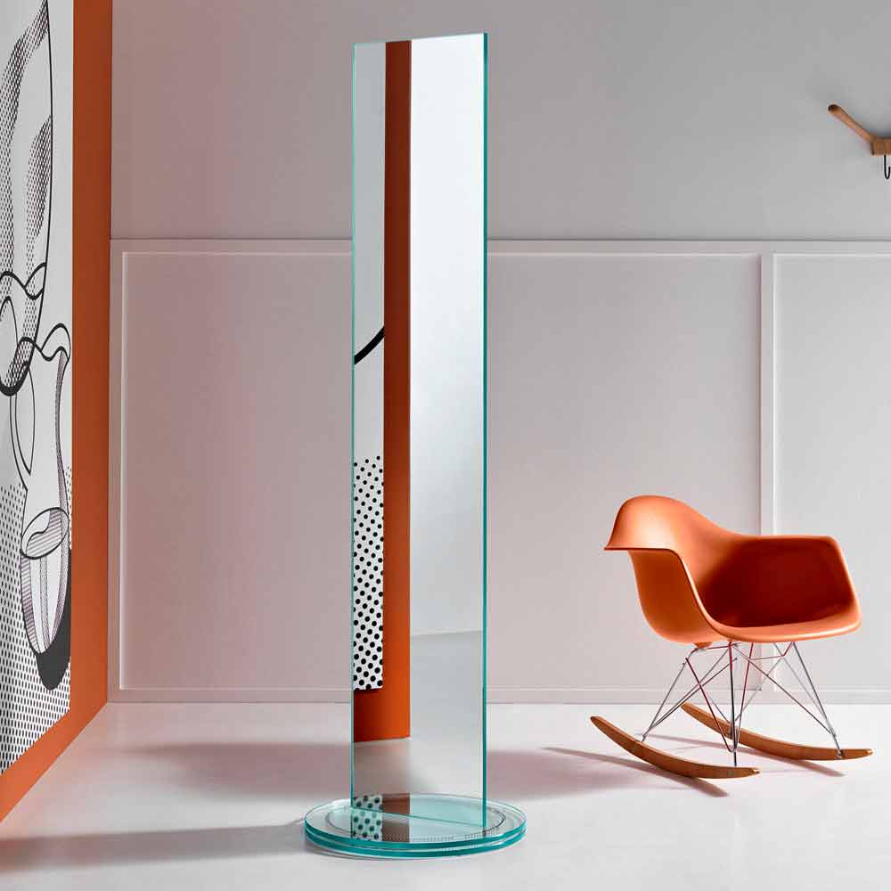 This freestanding mirror is characterized by its sculptural design entirely made of double-sided mirror with rotating base in tempered glass.