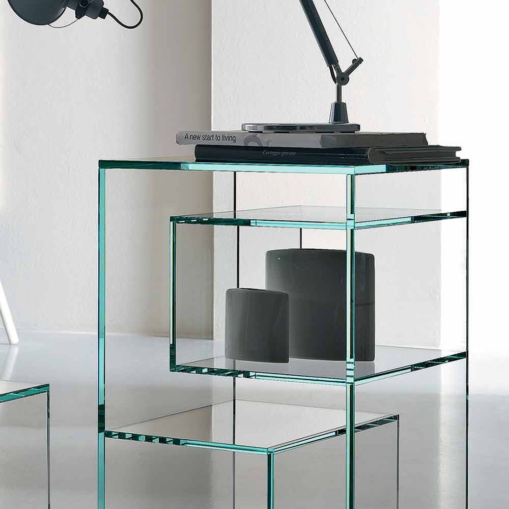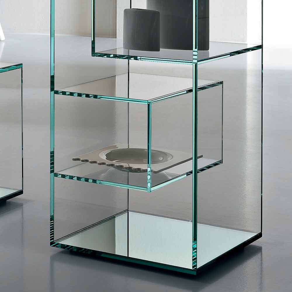 This display bookcase is characterized by its determined and elegant design entirely made of extra-clear glass.