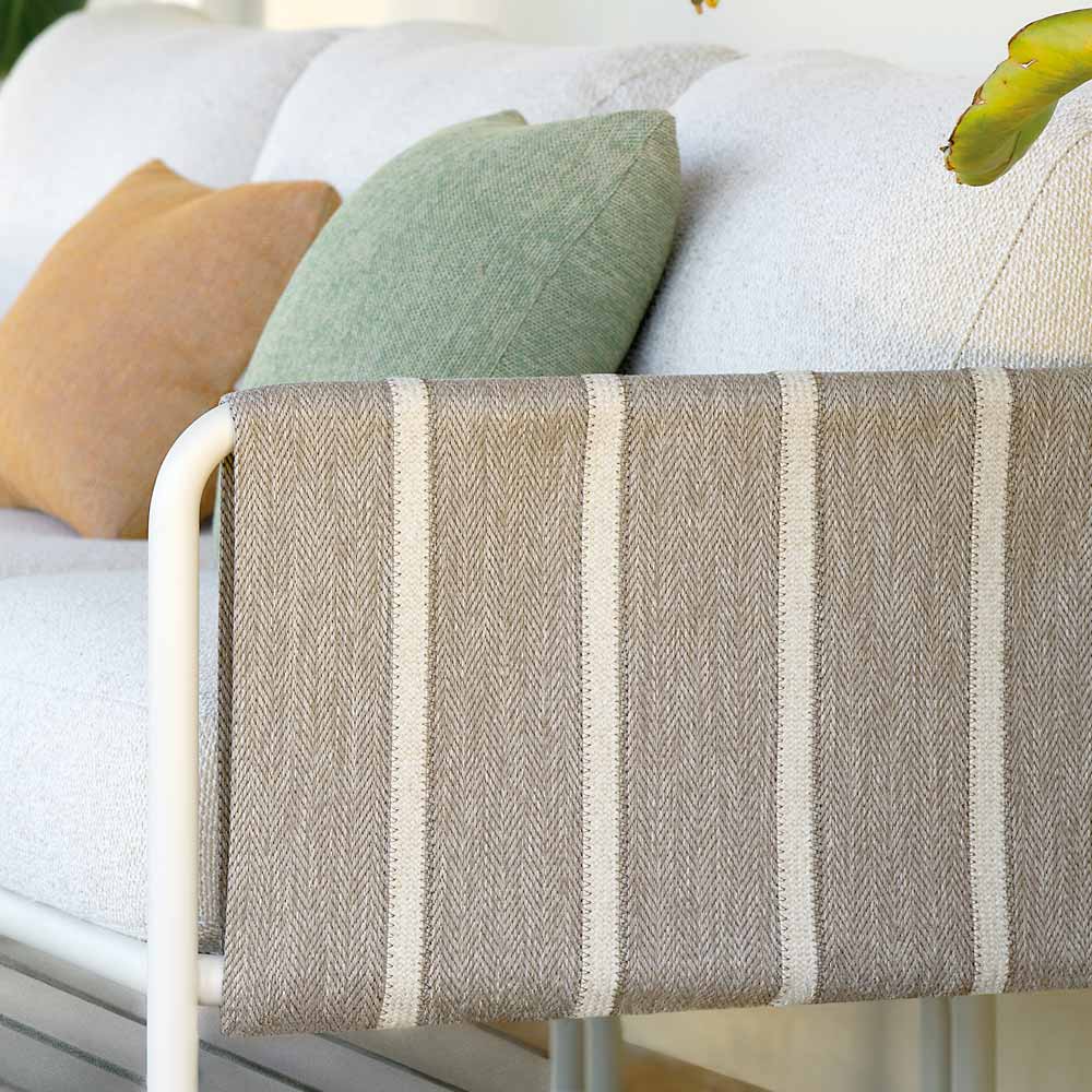 Sofa (2 corner elements + 1 central one): structure in powder-coated galvanized iron with pearl white finish, seat in elastic belt, cushions in white finish fabric and washable and removable armrest cushions.