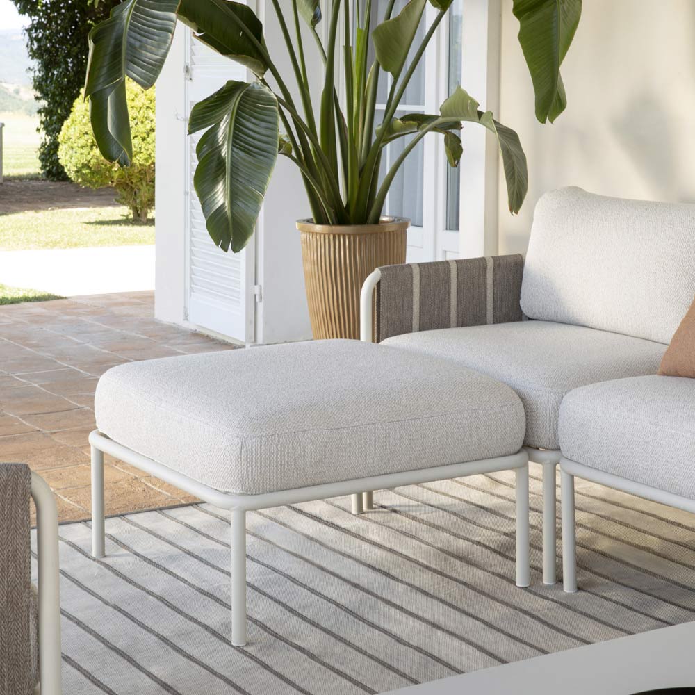The structure is made of powder-coated aluminum , a lightweight but extremely weather-resistant material, while the seat and backrest are enriched with soft padding and covered in high-quality outdoor fabric , designed to resist the sun and humidity without losing softness and beauty.