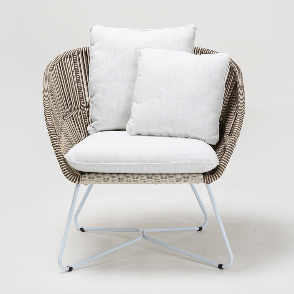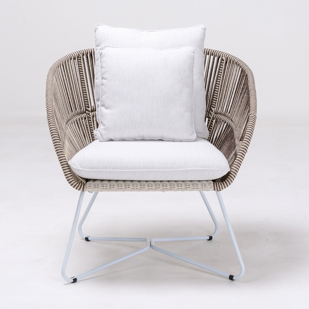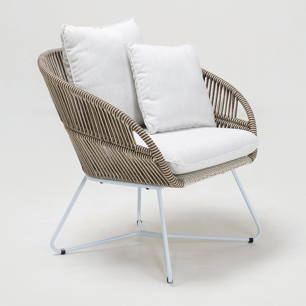 Olefin/PP ROPE weave with a two-tone pearl white and cappuccino finish and seat and back cushion in outdoor